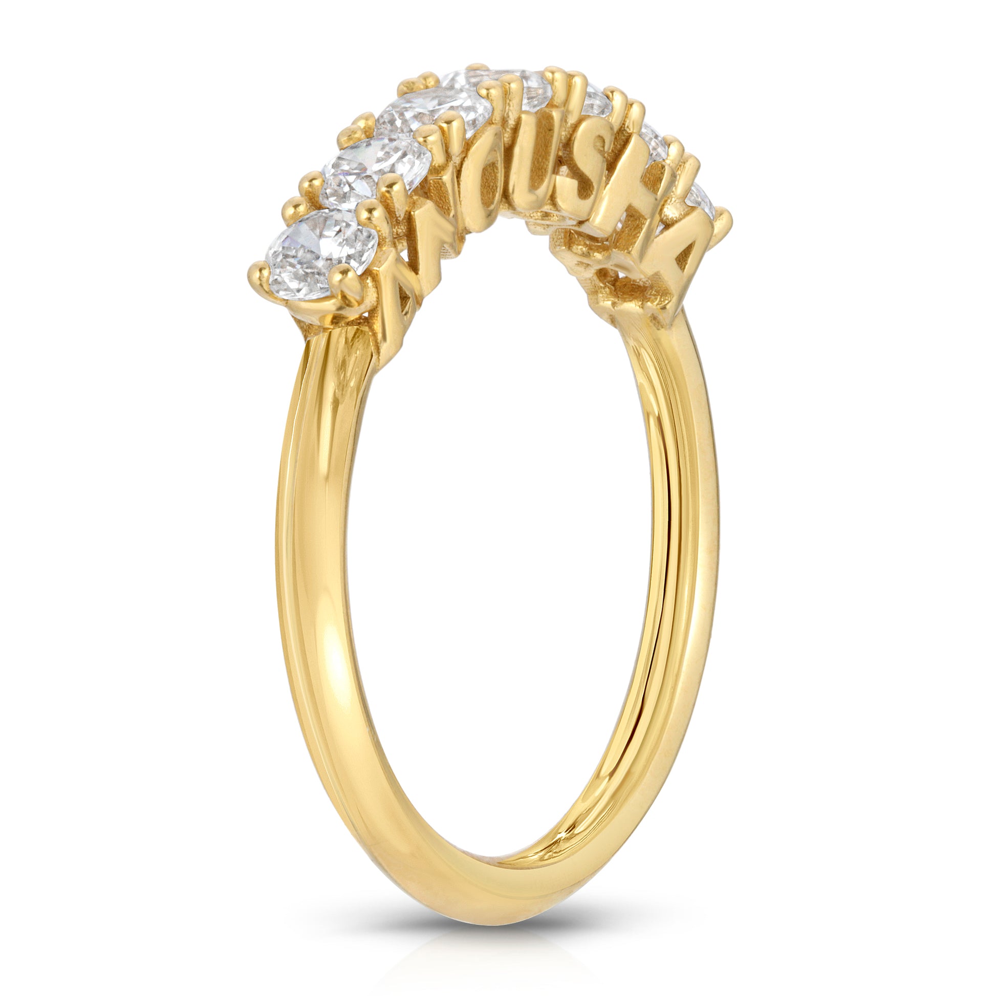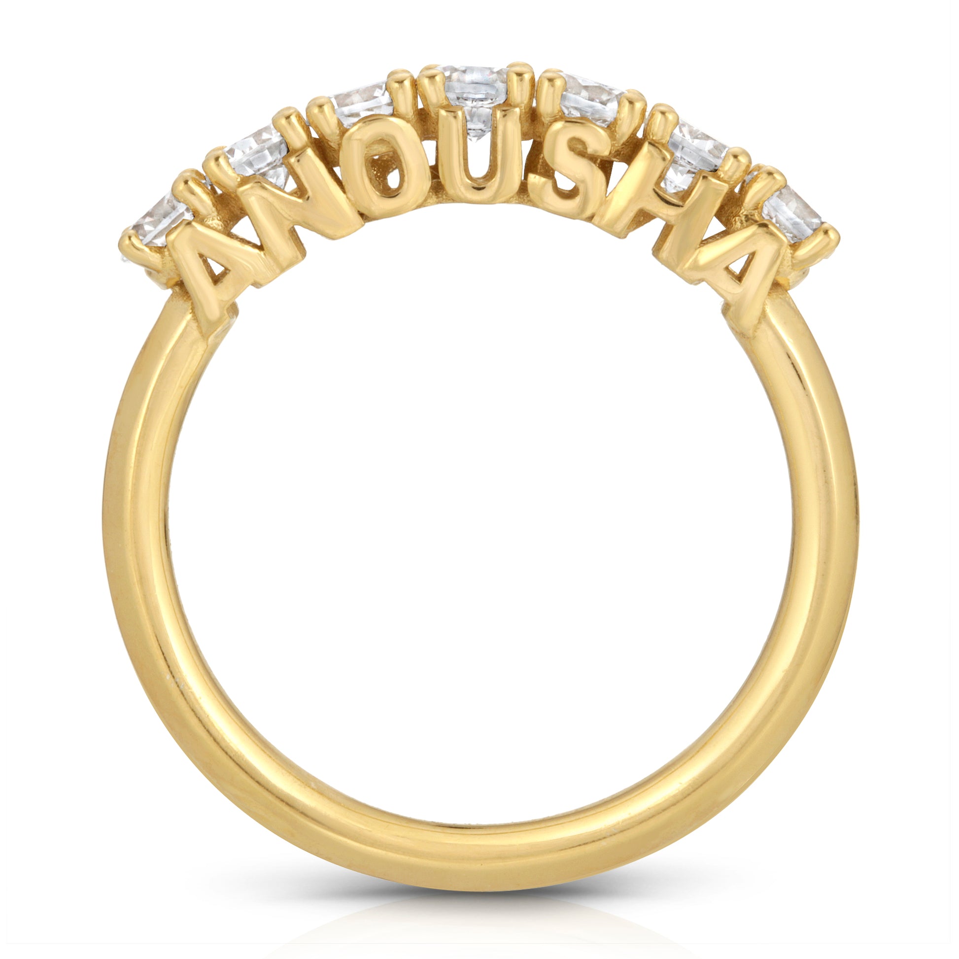 This beautiful multi-stone ring is fully customizable with your favorite stones. The setting of each stone is built of a letter from side view and the ring together spells out your choice of words. This gorgous name ring can be worn as a wedding band or as a fashion statement depending on your customization