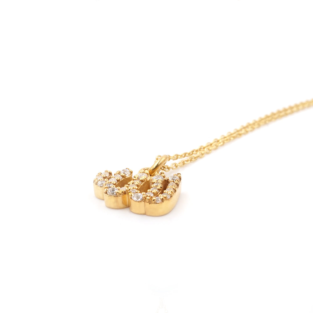 This necklace features a beautiful Allah symbol symbol in 18 or 14k gold hand set with white diamonds. Allah is the symbol of God and divinity in Islam