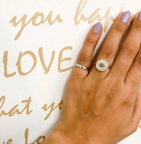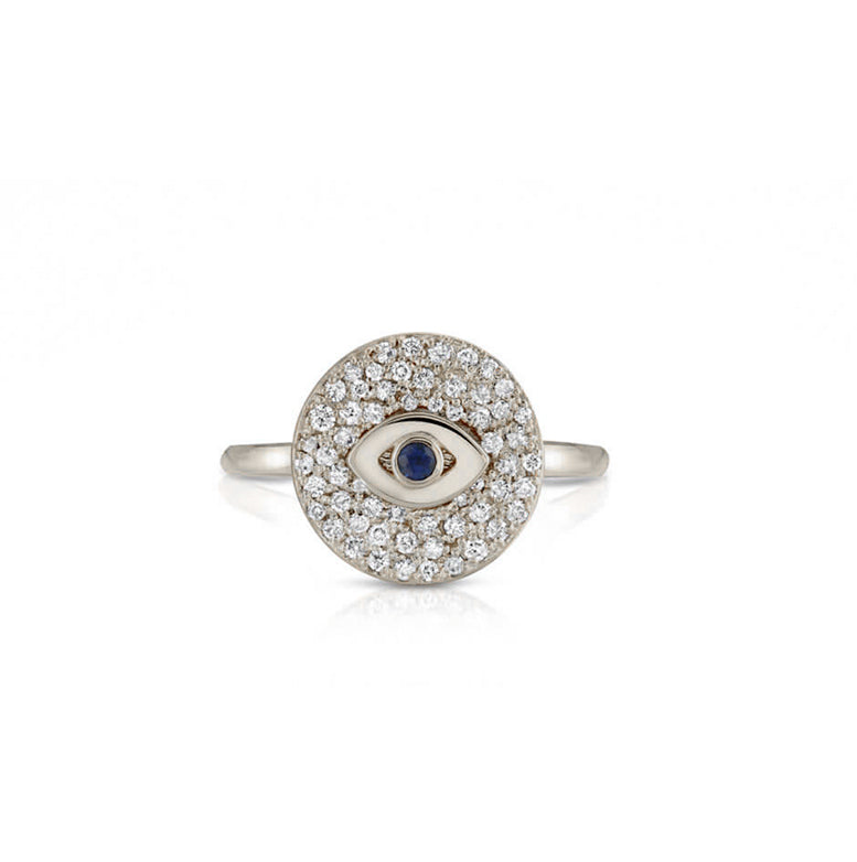 This beautiful ring features an evil eye on a diamond disk