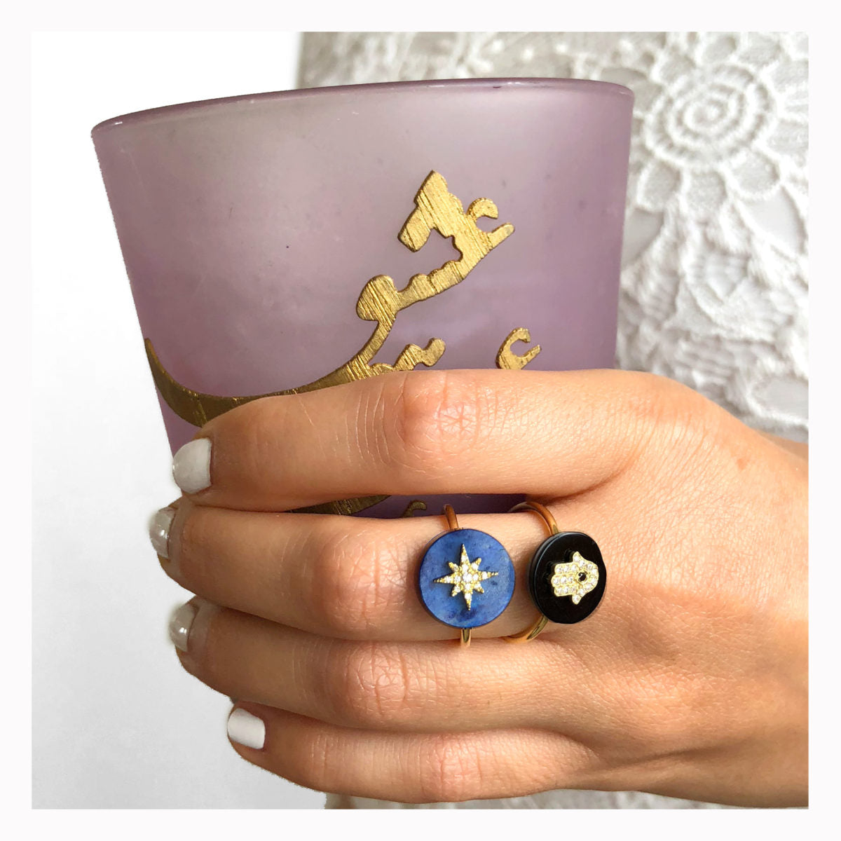 This beautiful ring features a North star on a genuine stone of your choice such as Turquoise, Onyx, Mother of Pearl, Pink Opal, Malachite or Lapis