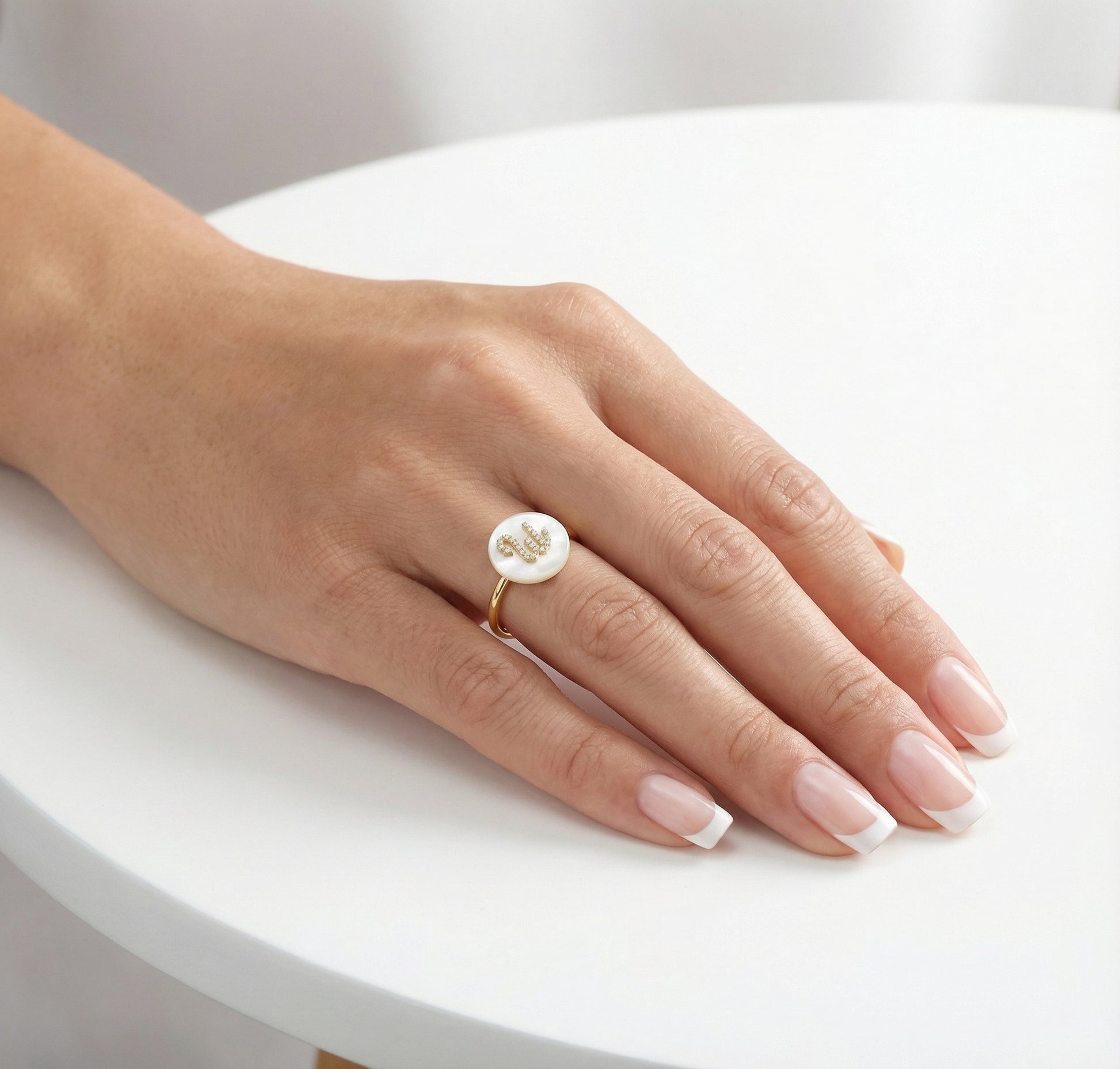 - This beautiful ring features a Mother of Pearl with a diamond scorpio symbol in the center