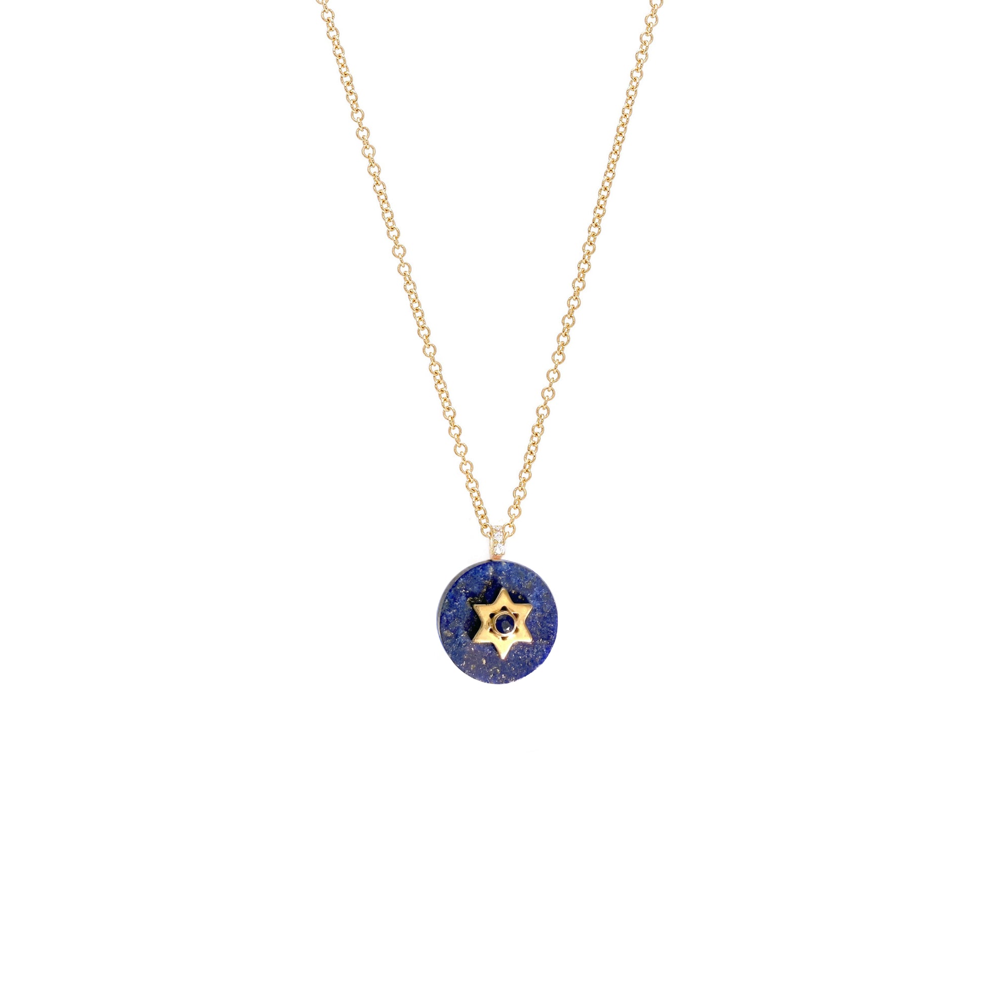 - This beautiful necklace features a Lapis pendant with a yellow gold Star of David in center with a blue sapphire.