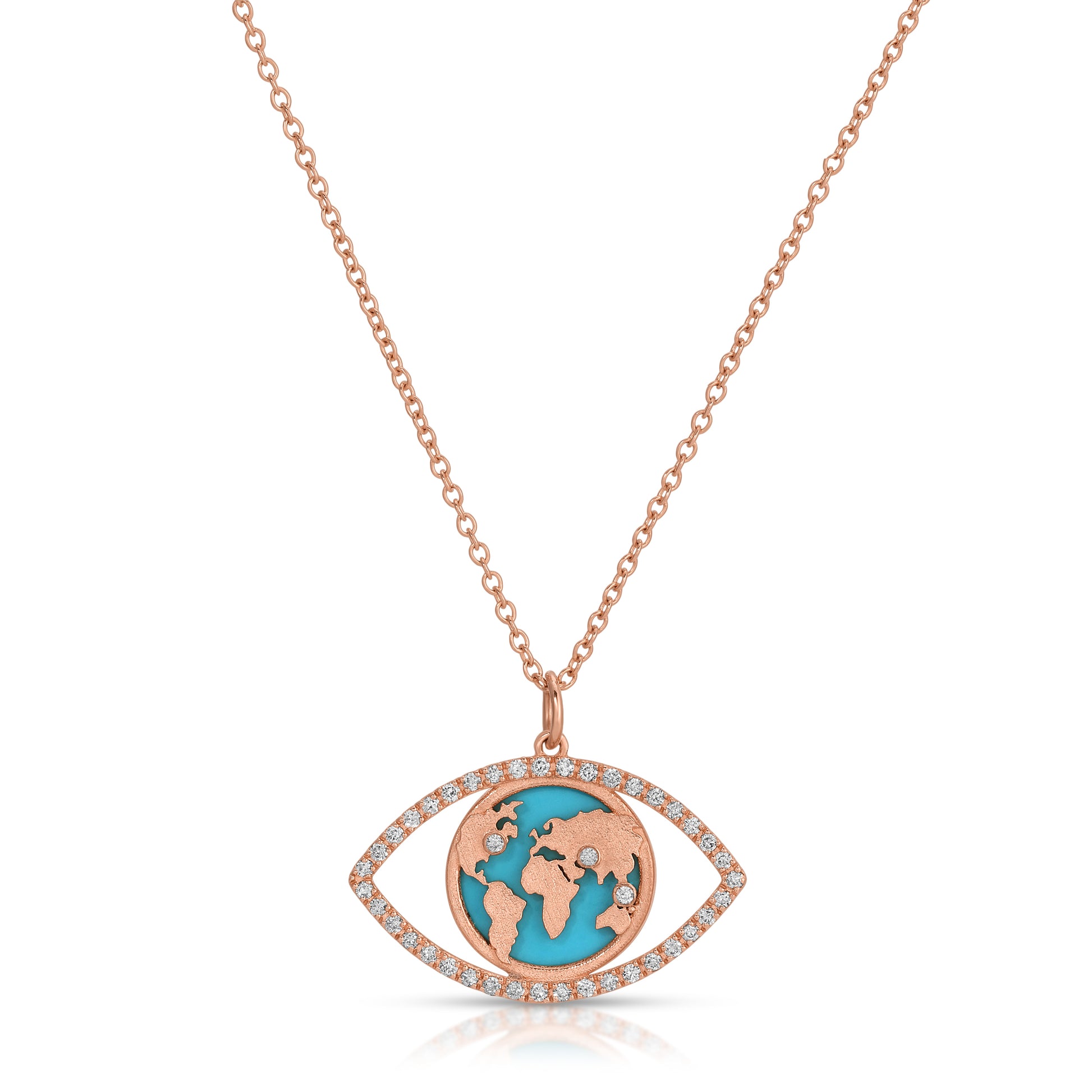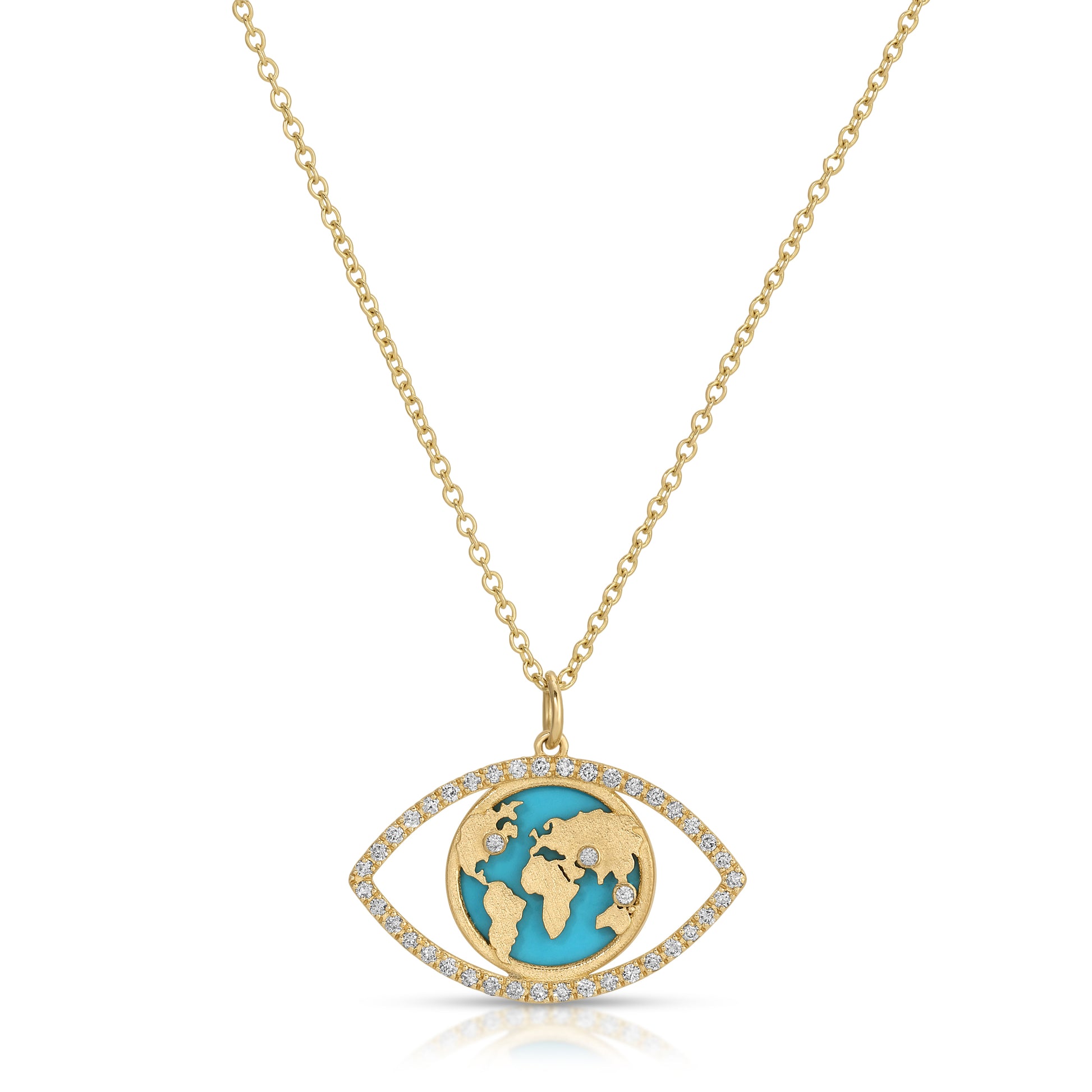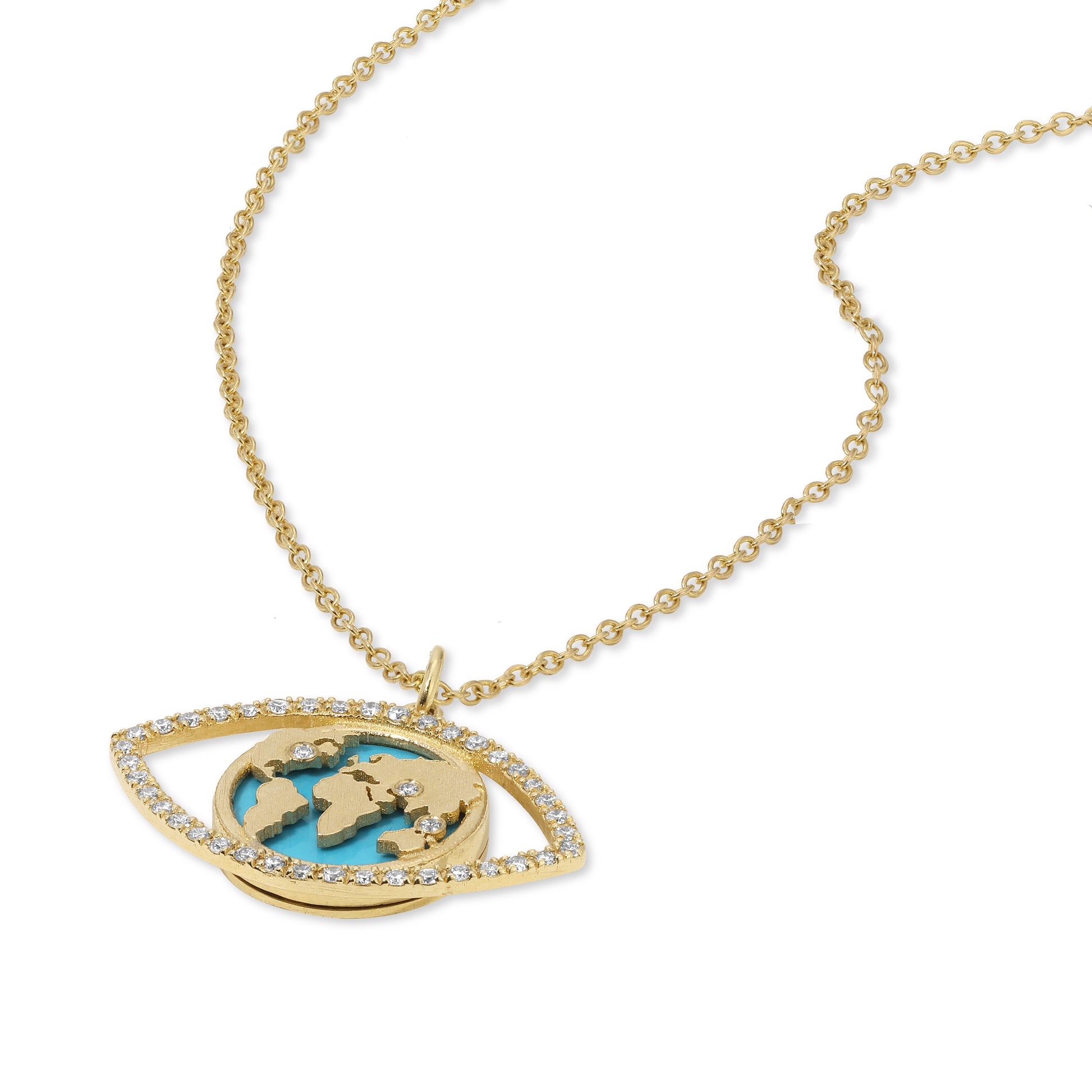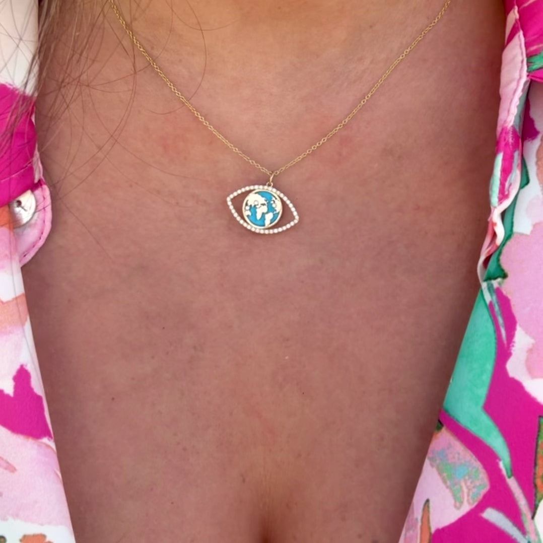 World Traveler Evil Eye Necklace – 14k Gold, Turquoise & Diamond World Map