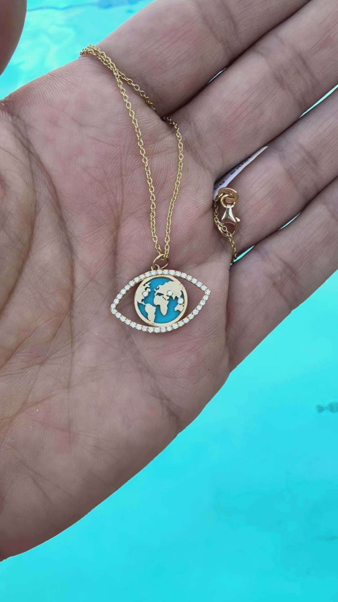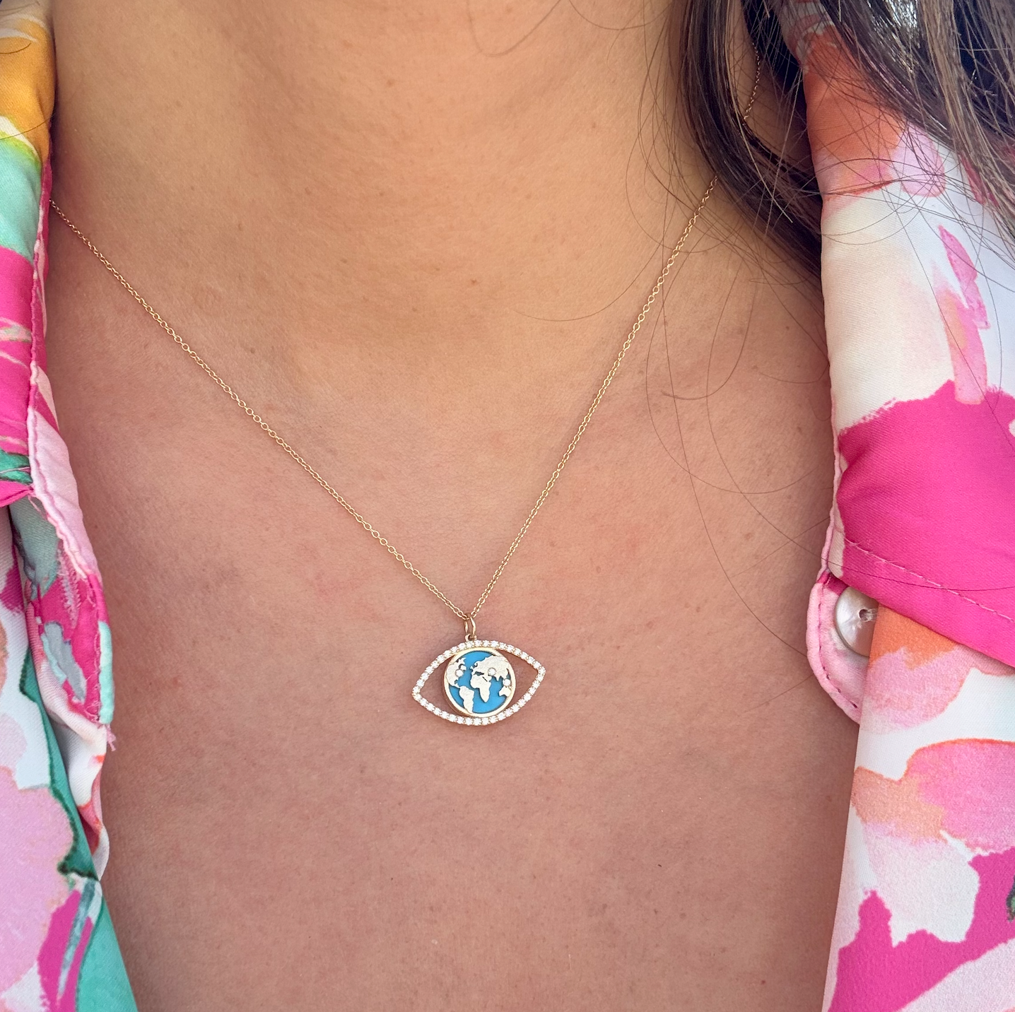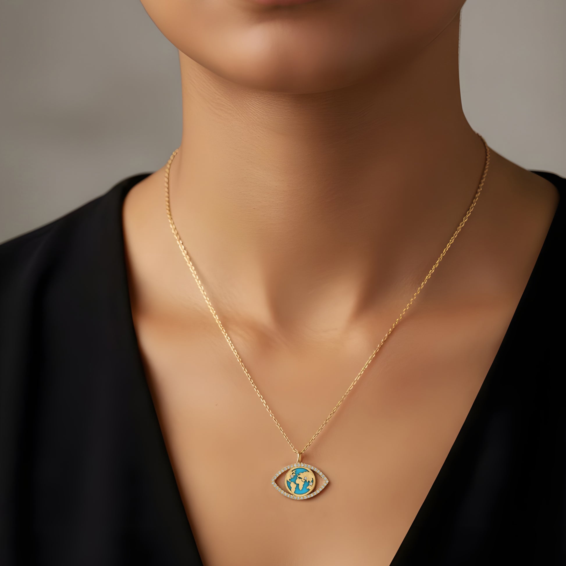 World Traveler Evil Eye Necklace – 14k Gold, Turquoise & Diamond World Map