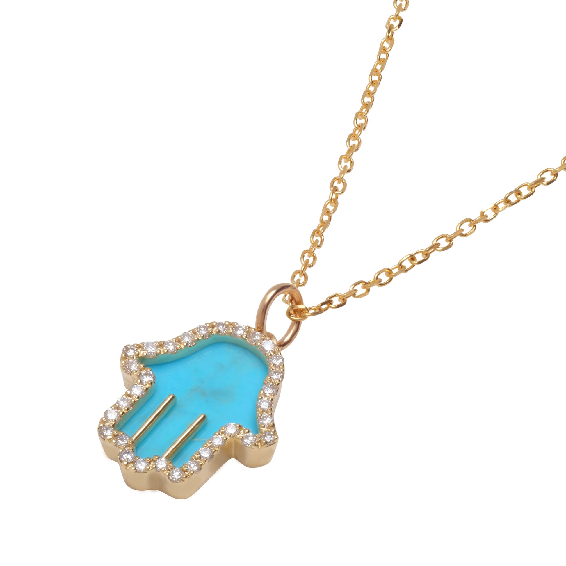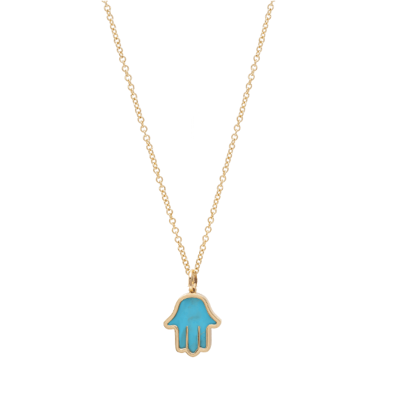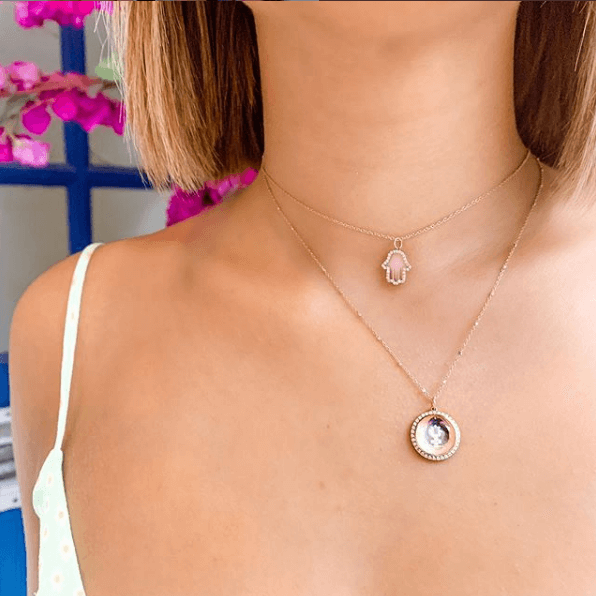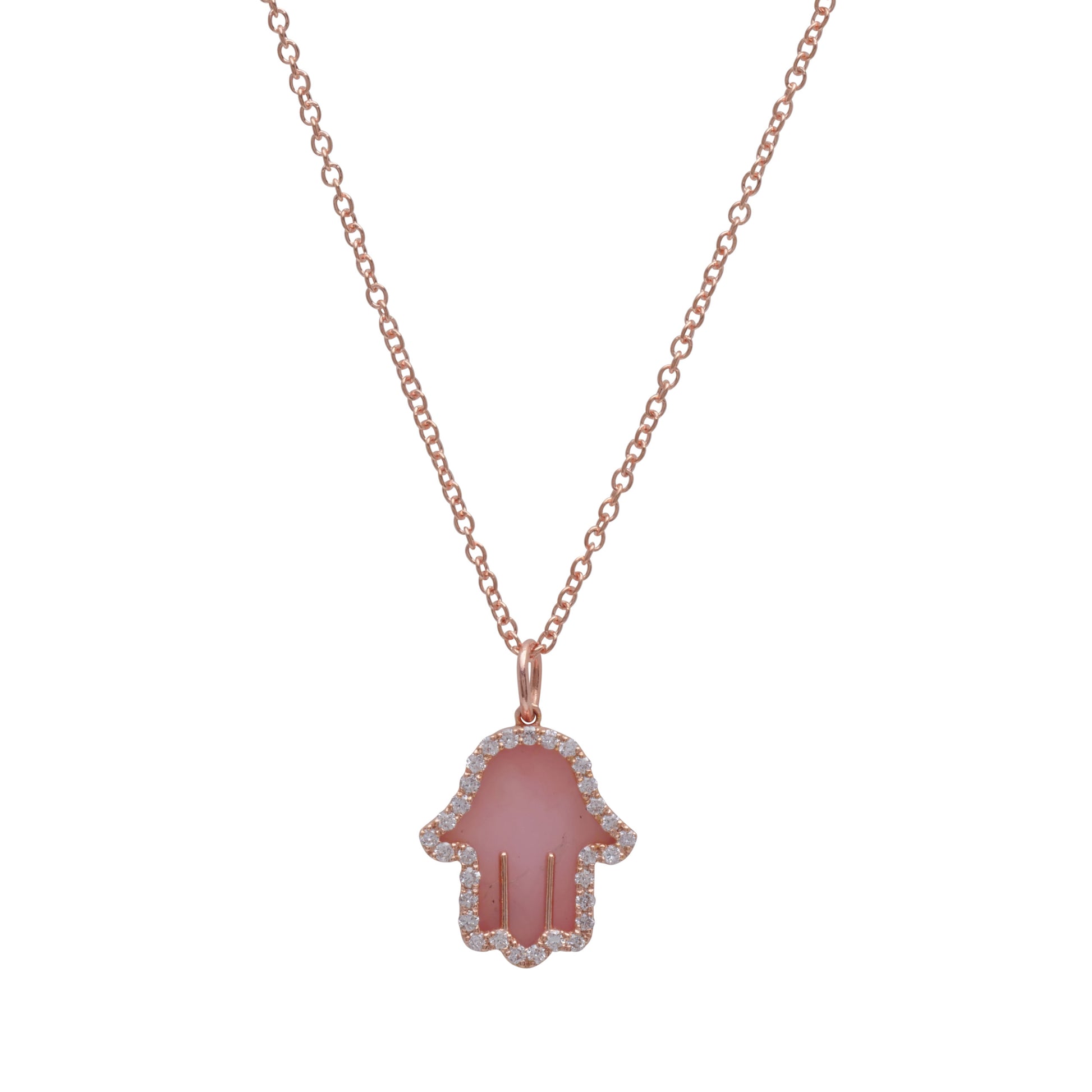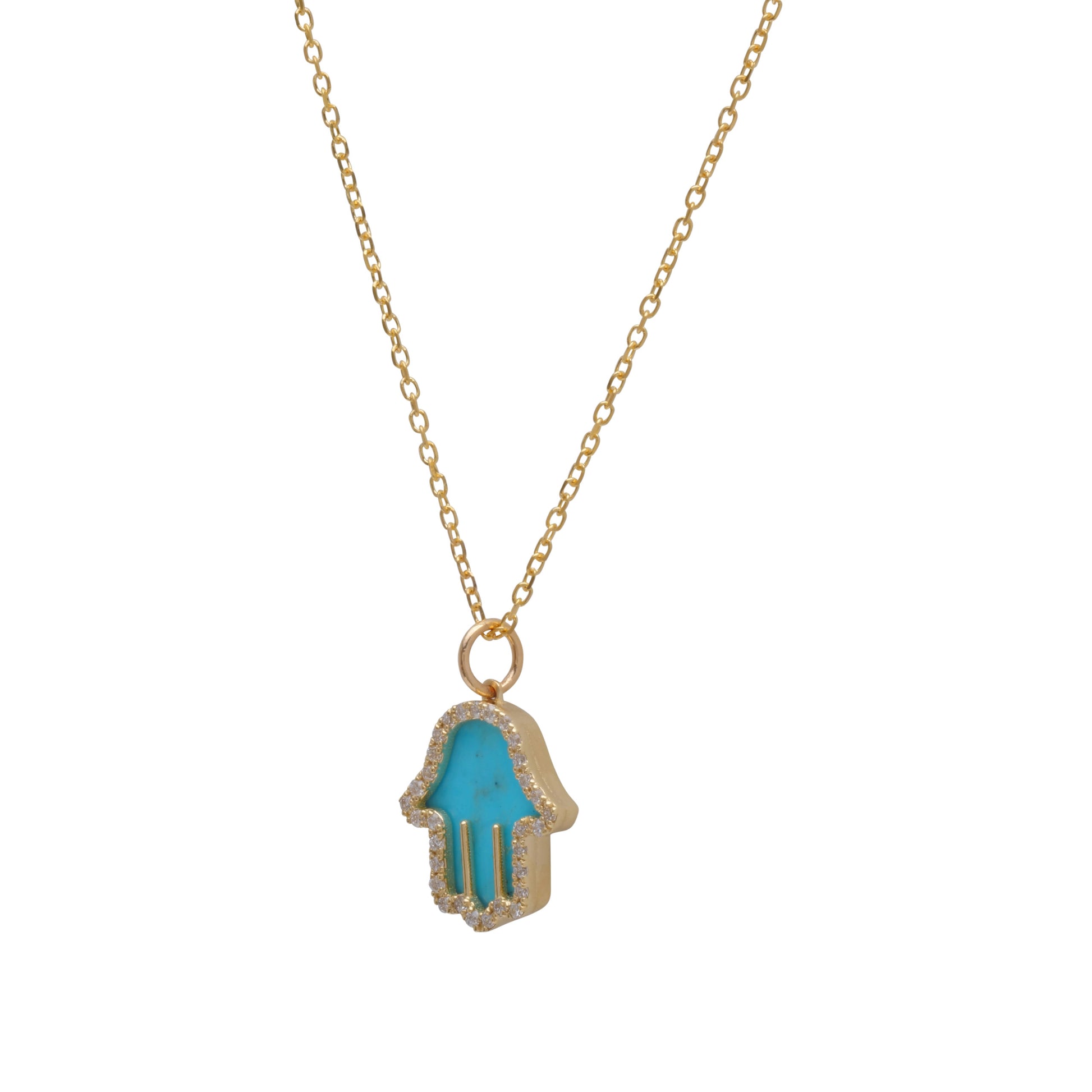 This beautiful necklace features a Hamsa symbol with a plain or pave of diamonds on a delicate chain with a genuine stone set in the back. layer it with our other essentials symbols or wear it separately.