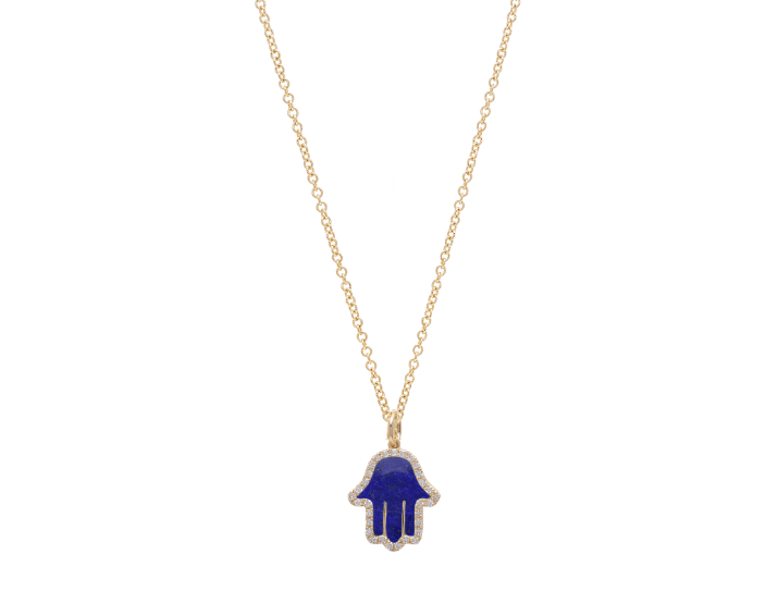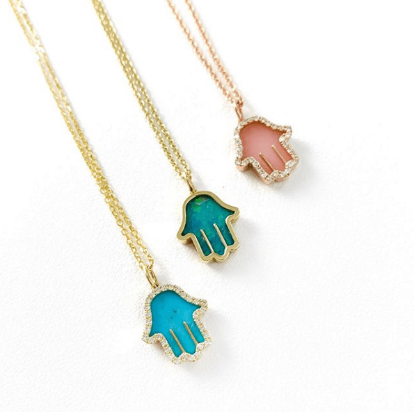 This necklace features a beautiful Hamsa symbol in 18 or 14k gold handset with white diamonds and your choice of colored stone. Hamsa is a popular symbol that offers protection and keeps away all evil.