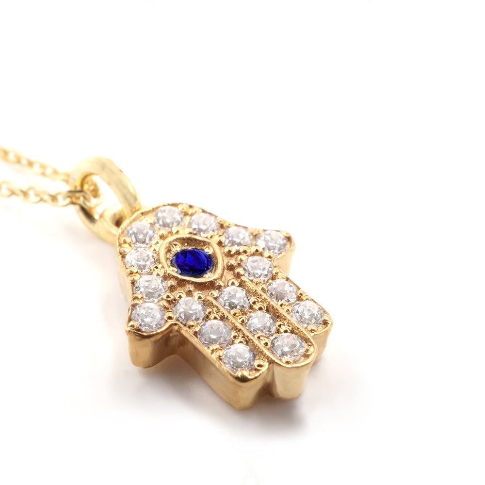 This necklace features a beautiful Hamsa symbol symbol in 18 or 14k gold hand set with white diamonds and a blue sapphire. Hamsa is a popular symbol that offers protection and keeps away all evil.