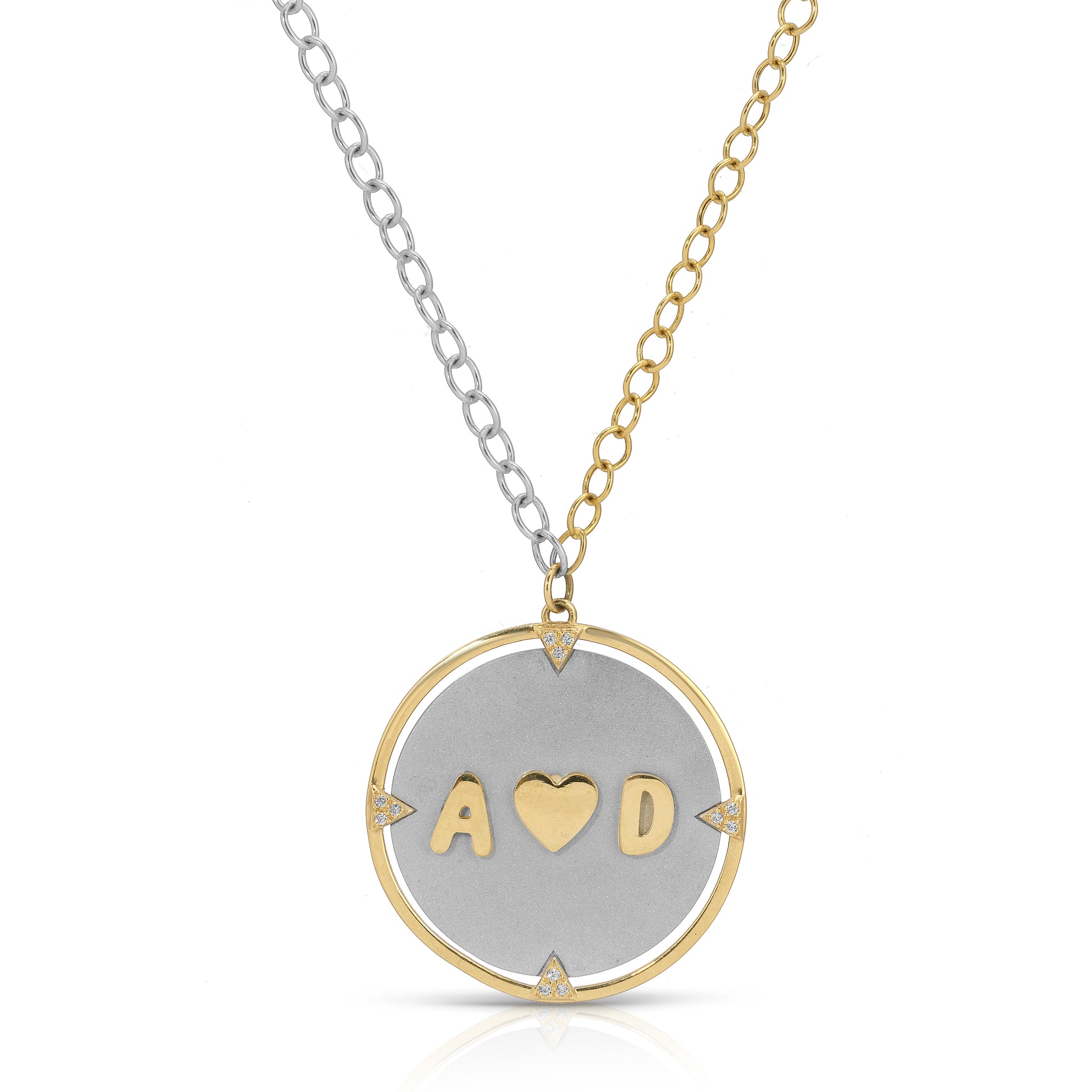 At the center, bold gold letters (and even a heart symbol) stand out beautifully against the silver backdrop. The round medallion is framed in gold and accented with brilliant natural diamonds at the four compass points, adding just the right amount of sparkle.