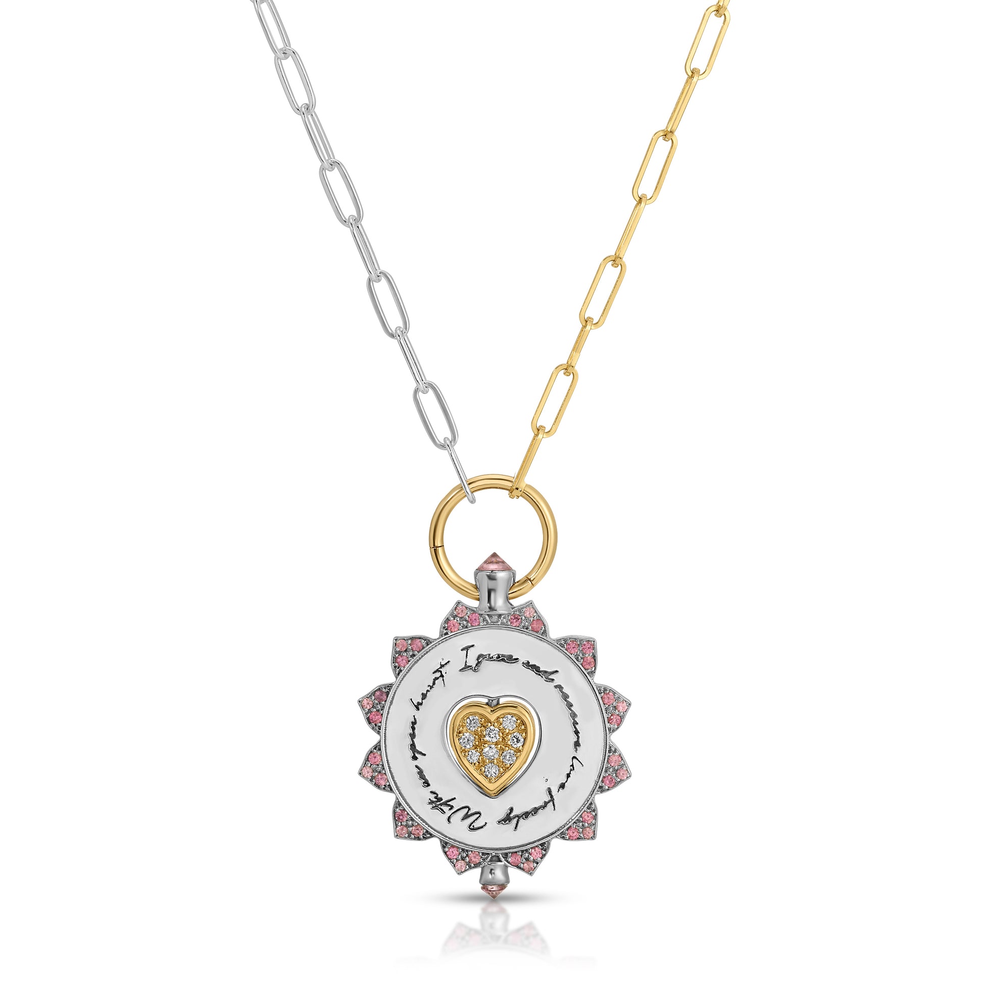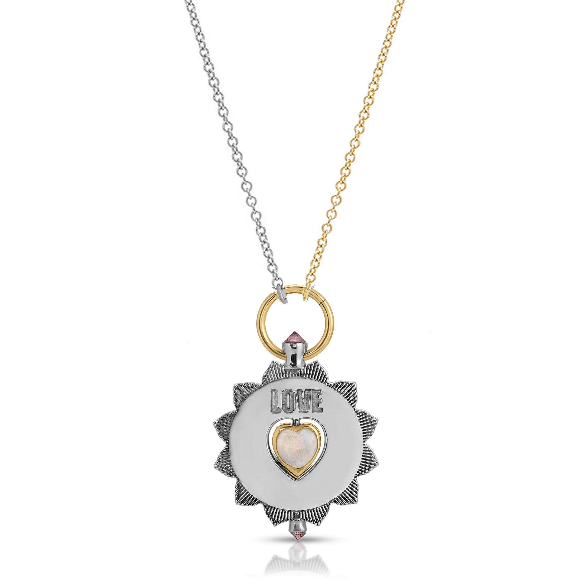 At its core, a solid 14k gold heart rests within a sunburst halo — representing warmth, compassion, and openness of the Anahata (heart) chakra. The dual-tone chain in white and yellow gold adds a contemporary balance, symbolizing unity and duality in love.