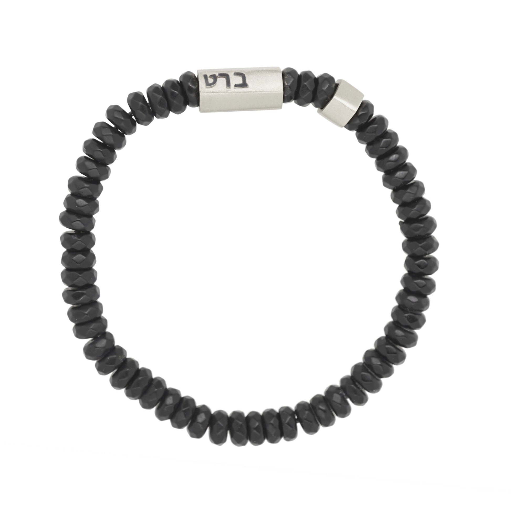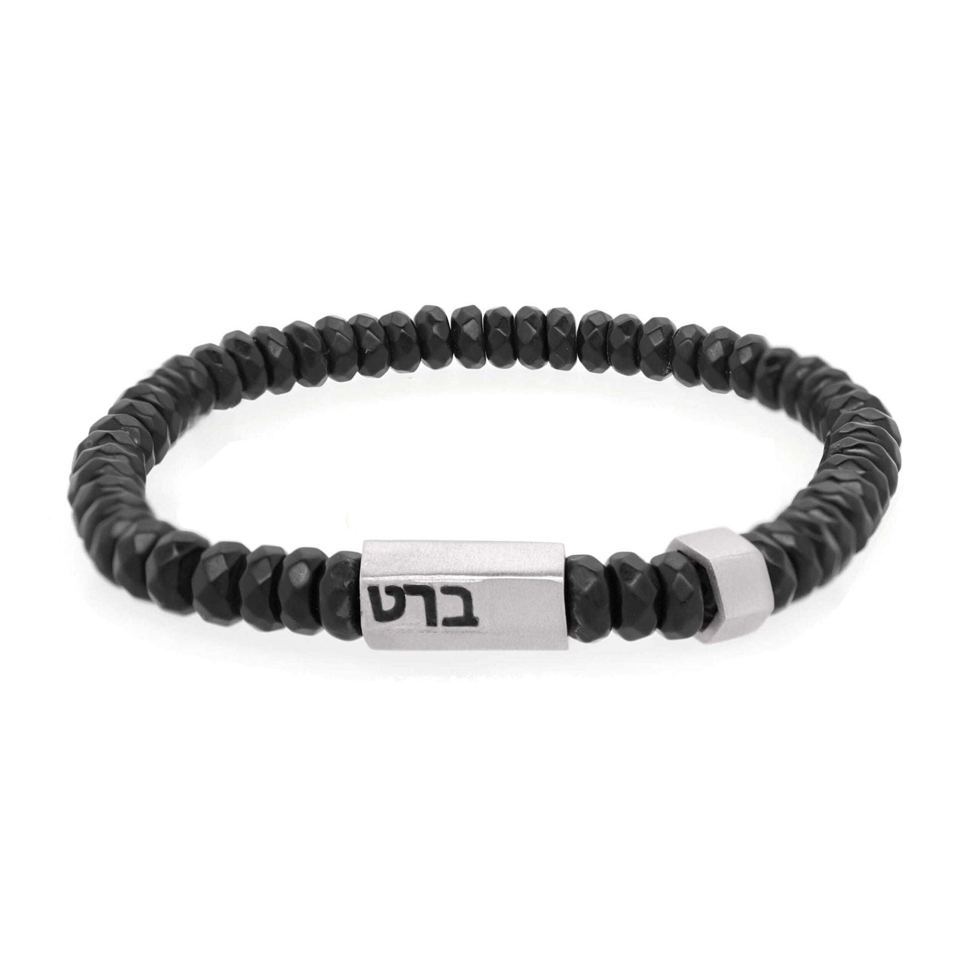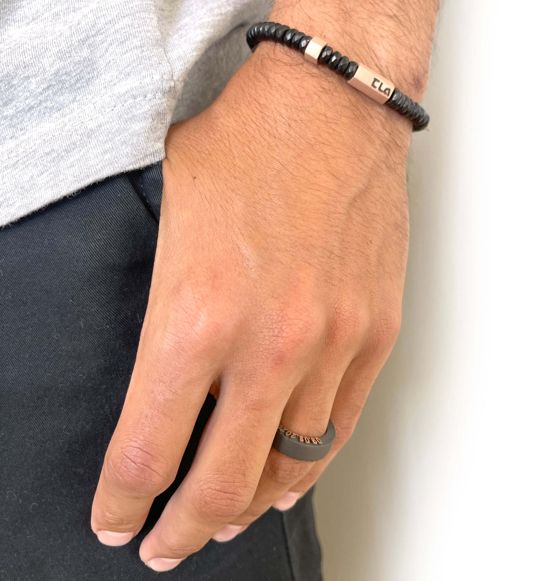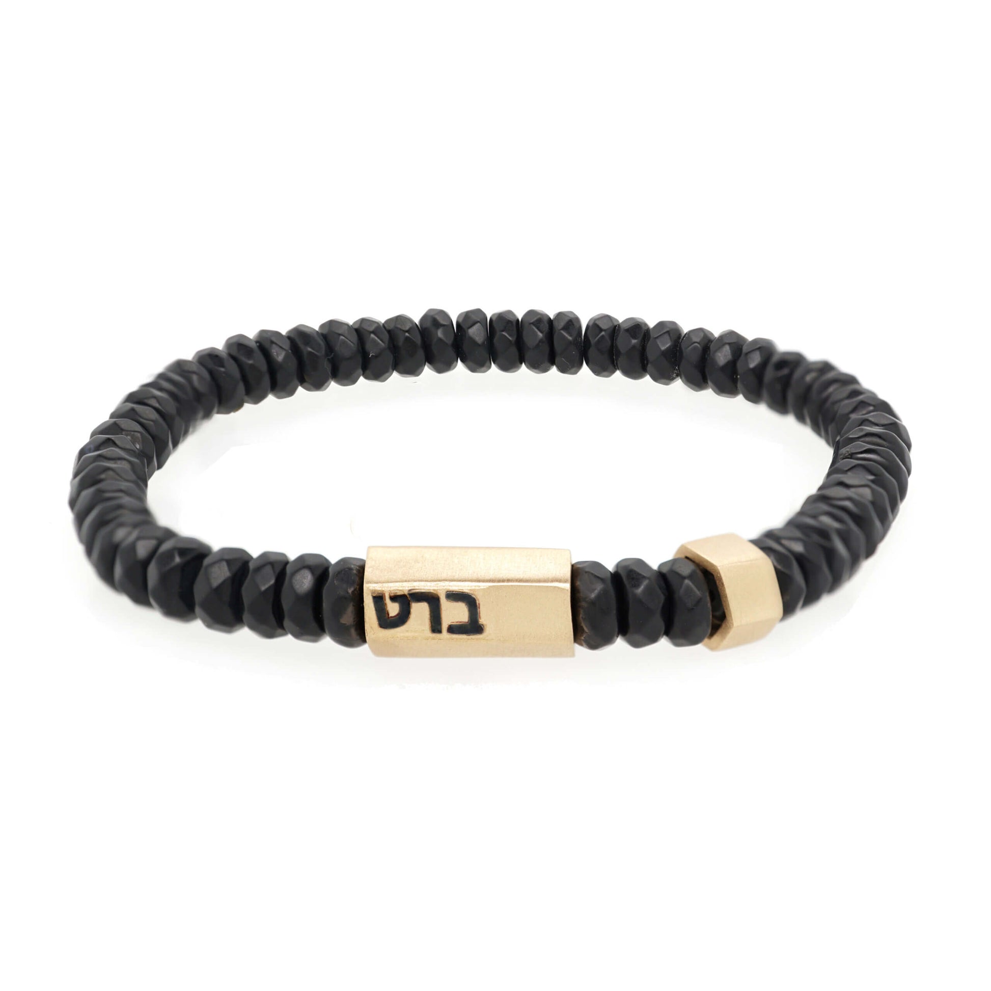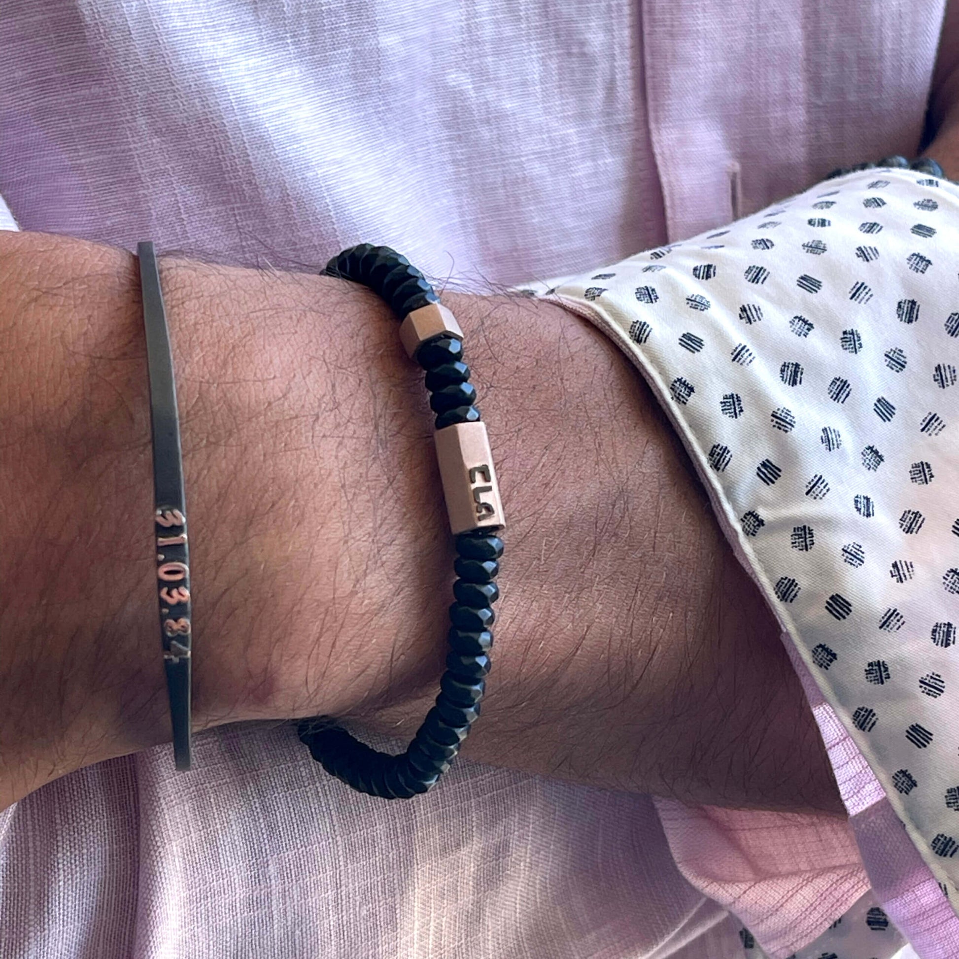 What could be more bold and cool than this Boltagonal beaded bracelet for the special man in your life? Made of solid gold and genuine onyx/turquise or Lapis beads, this bracelet can be customized in any language you desire.