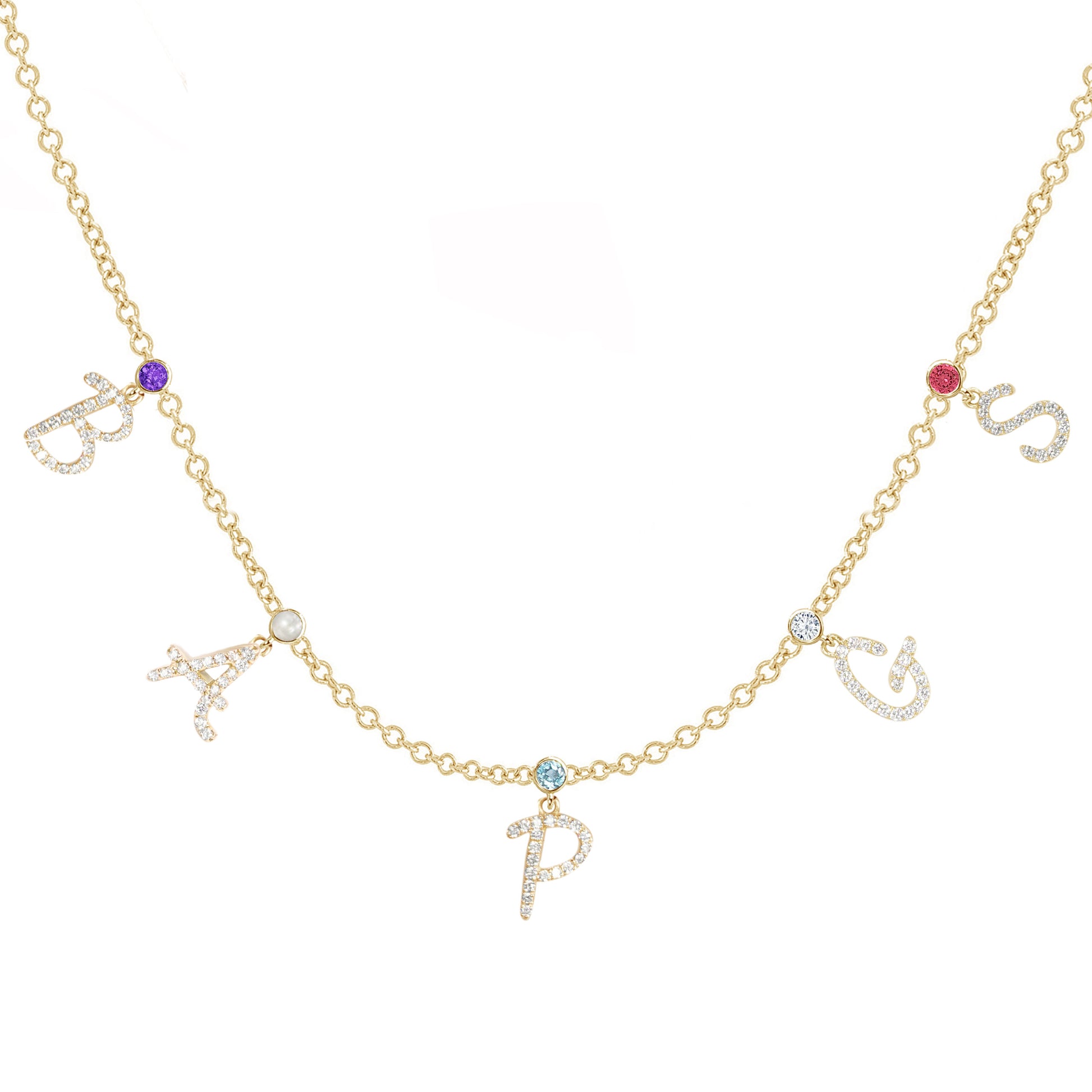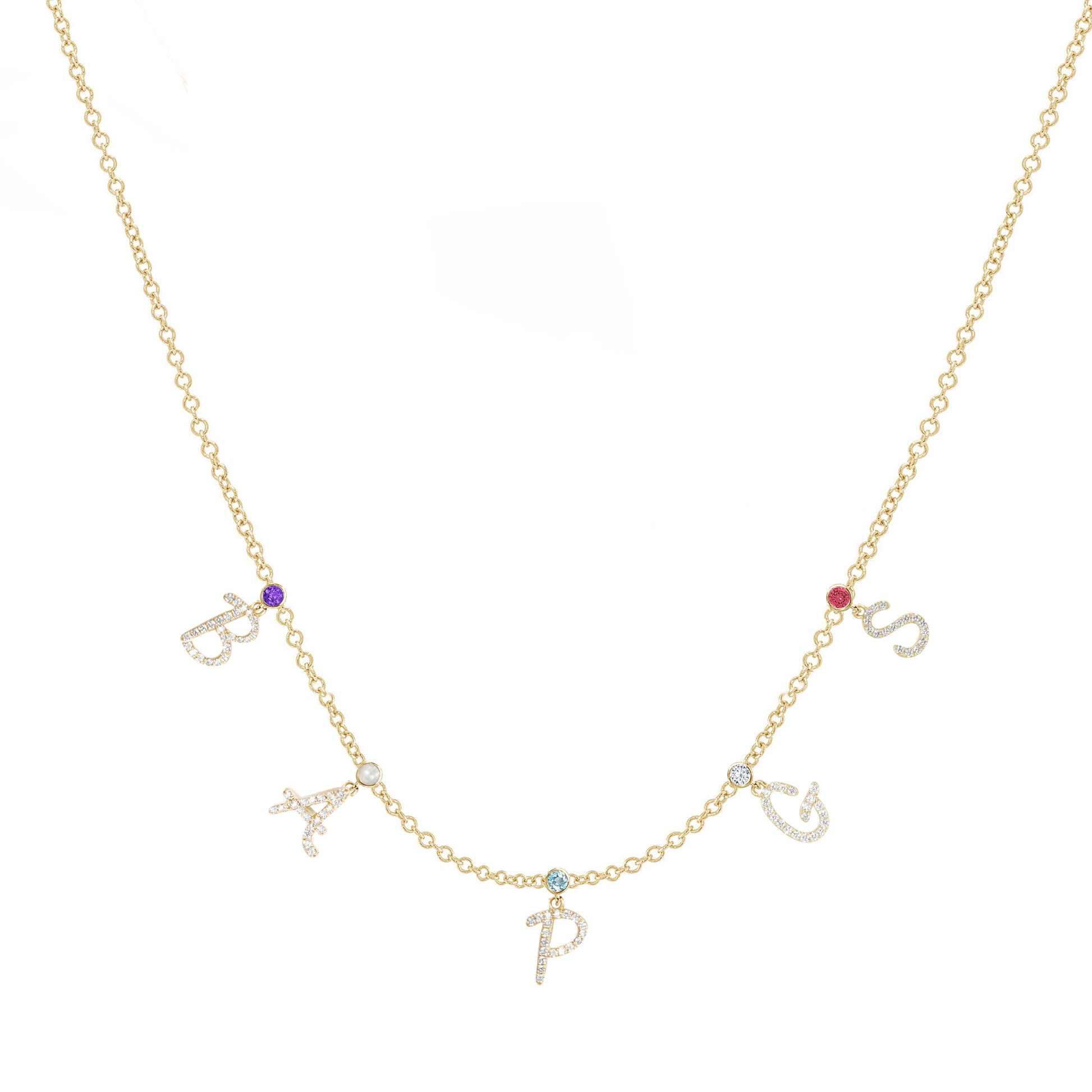 This beautiful piece allows you to design a necklace that is as unique as your family. Each letter can be customized with the gemstone that is the birthstone of that special person in your life. Perfect for moms who want to always hold a piece of their family close to their hearts.