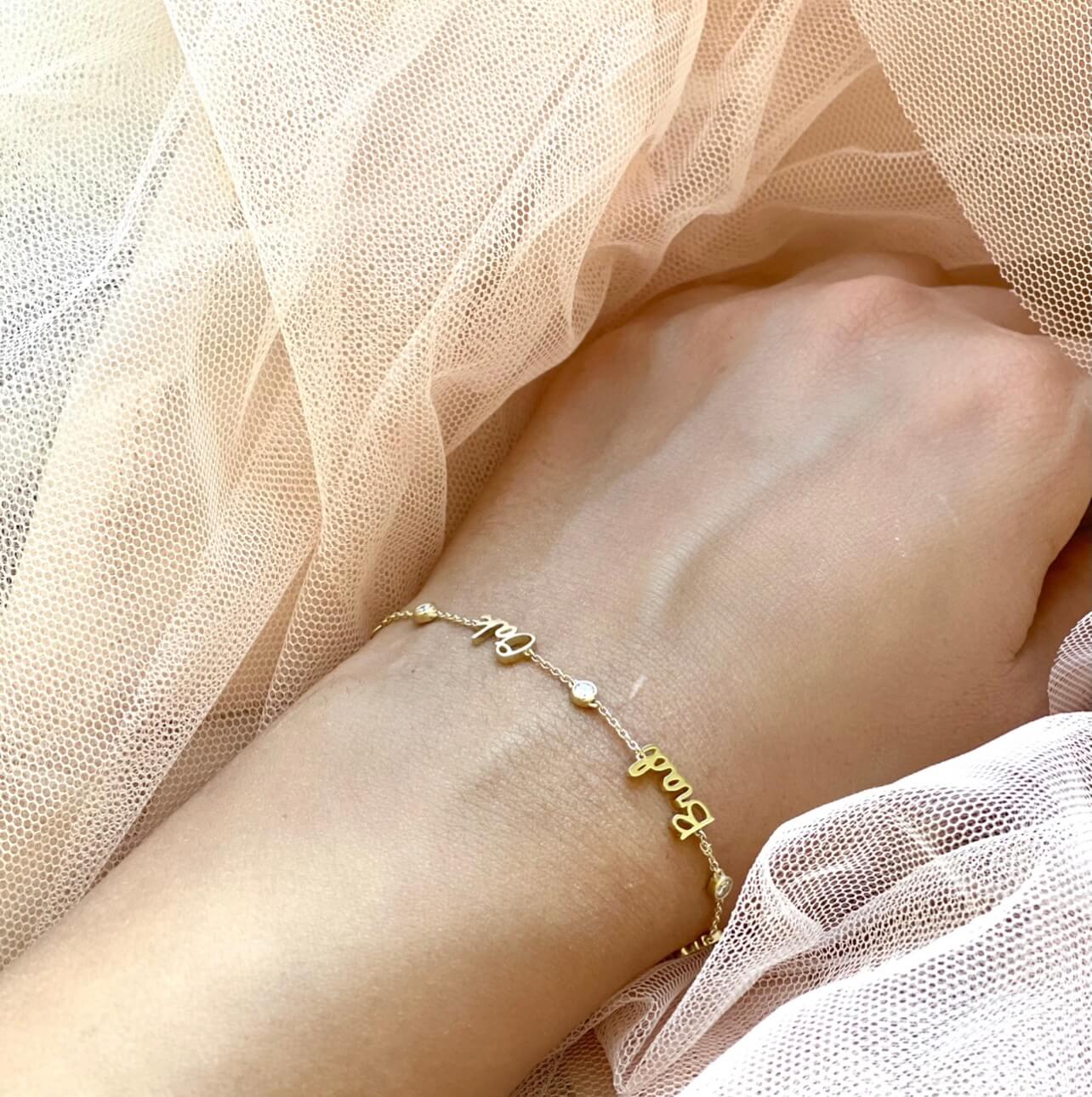 The prettiest most delicate name bracelet anywhere on the world wide web, that is our promise. This bracelet writes your name or special word in our special handwritten font using 14k gold and white diamonds. It comes in 7 inches long with two shortening rings which allow you to wear the bracelet at different lengths. Wear them individually or layer them up for an added pinch of glam. When we receive your order, we will send you a computer-generated image of your bracelet before starting production. For any further customization one to five names or words, please contact us.