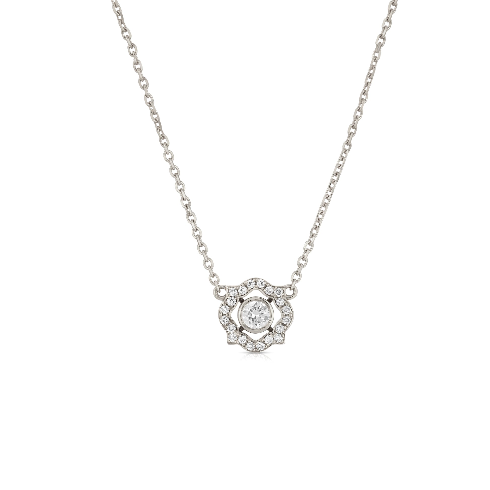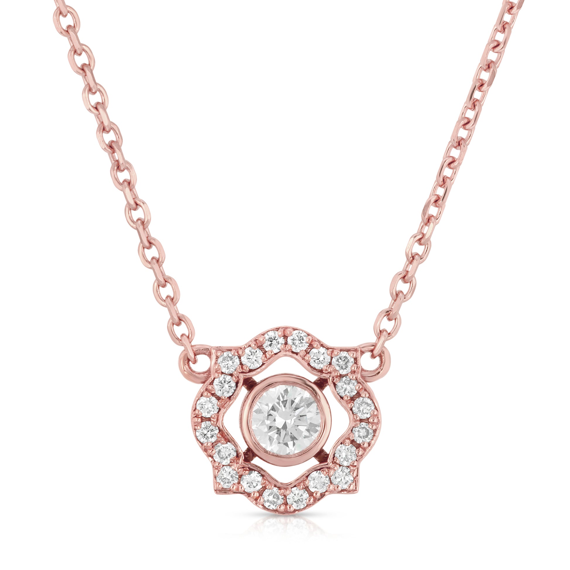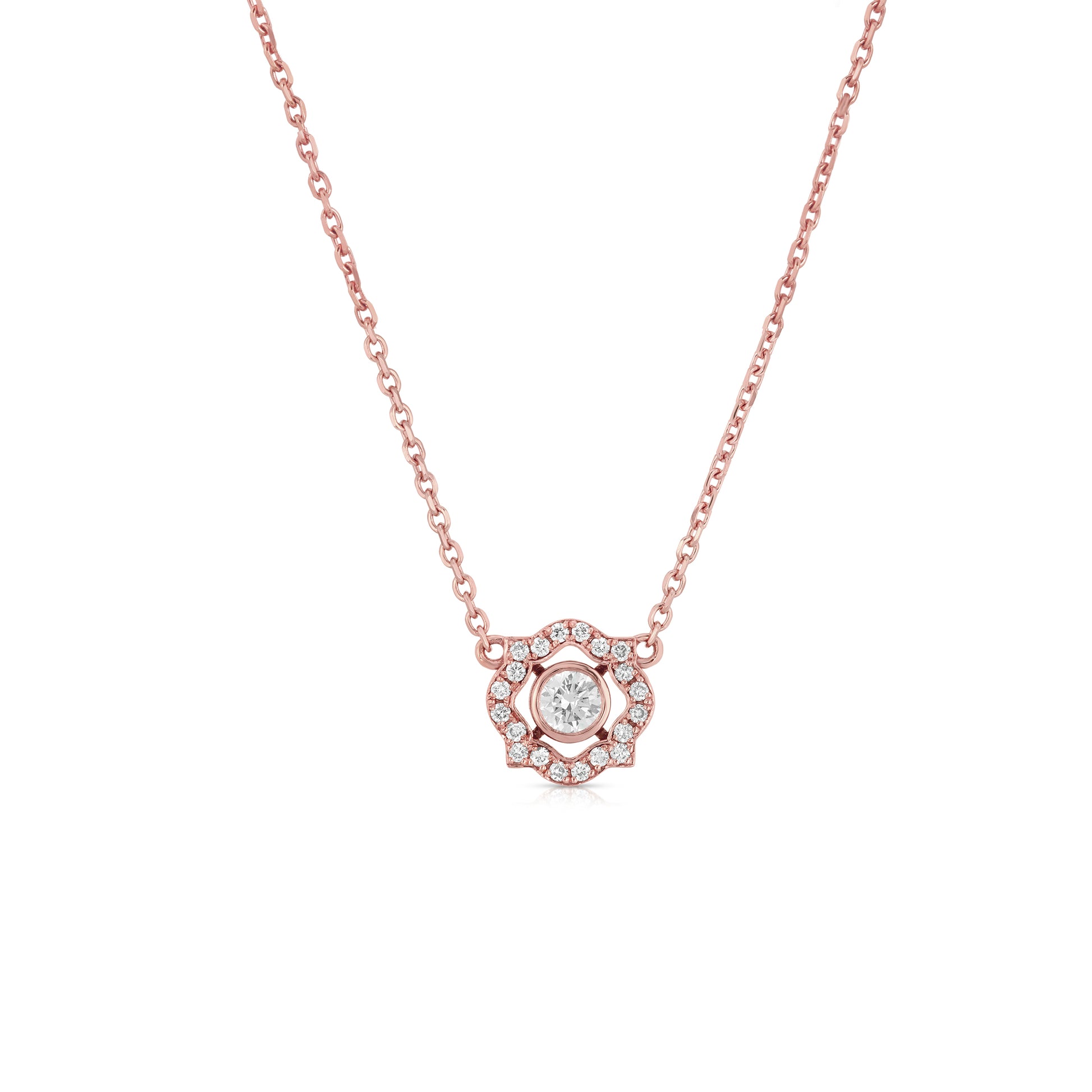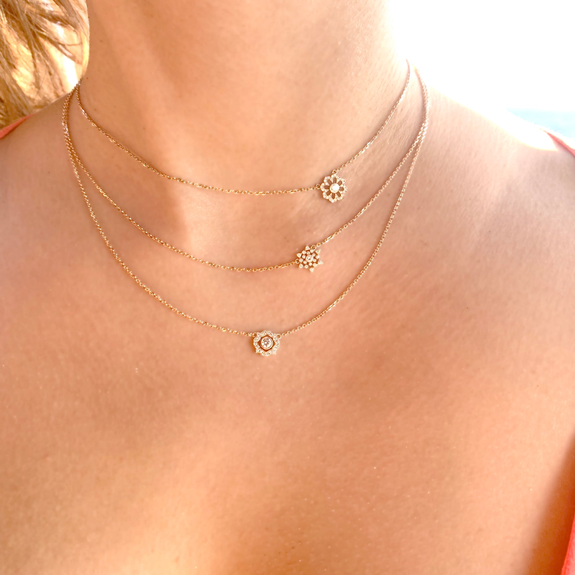 This beautiful necklace features a flower set with white diamonds in pave and bezel setting. The chain is a detailed tight cable chain that catches and reflects light as you move. The diamonds set are SI1 quality in white color to add shine and glitter.