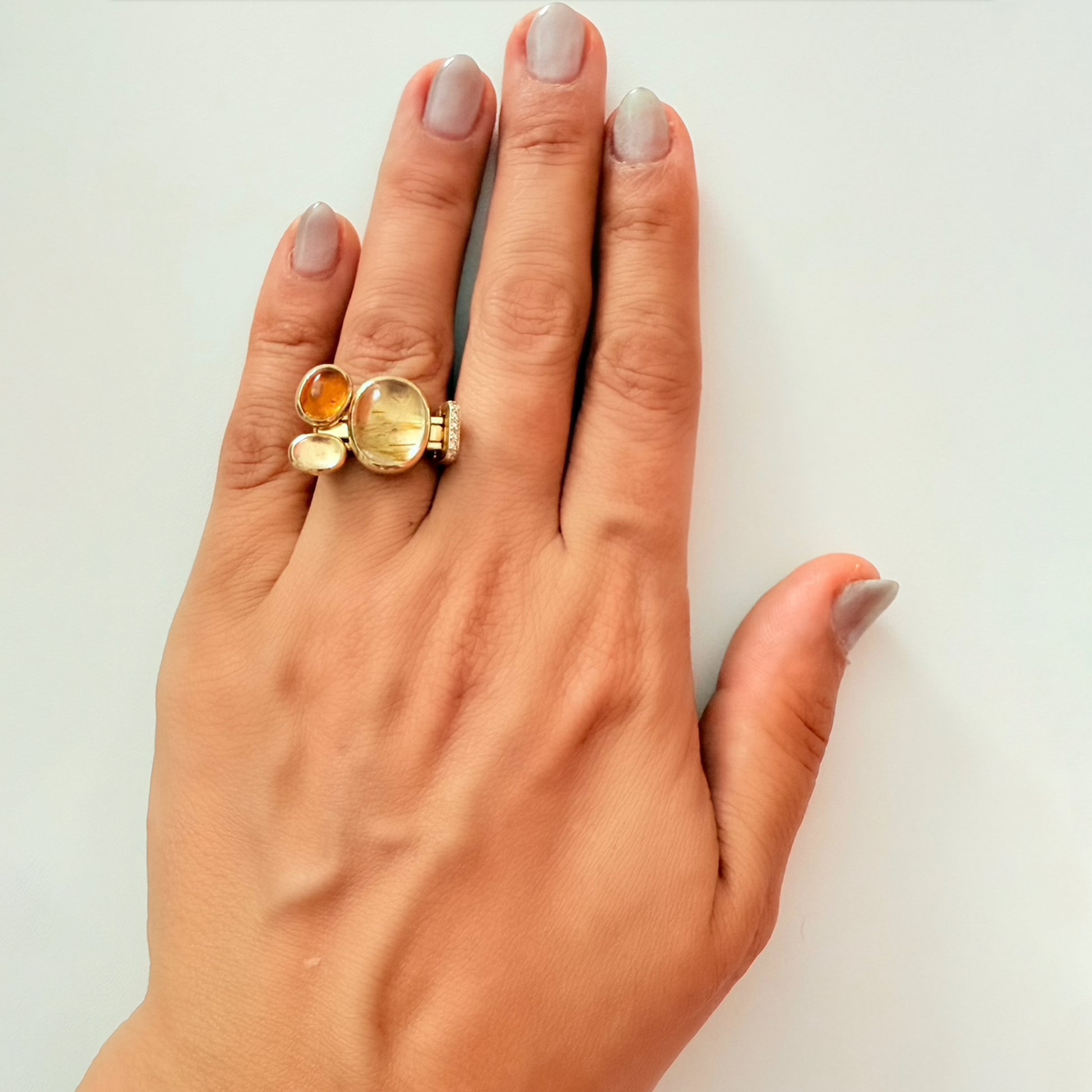 One of a kind, LNQD Stacking Ring; Rutilated Quartz, Amber Moon stone