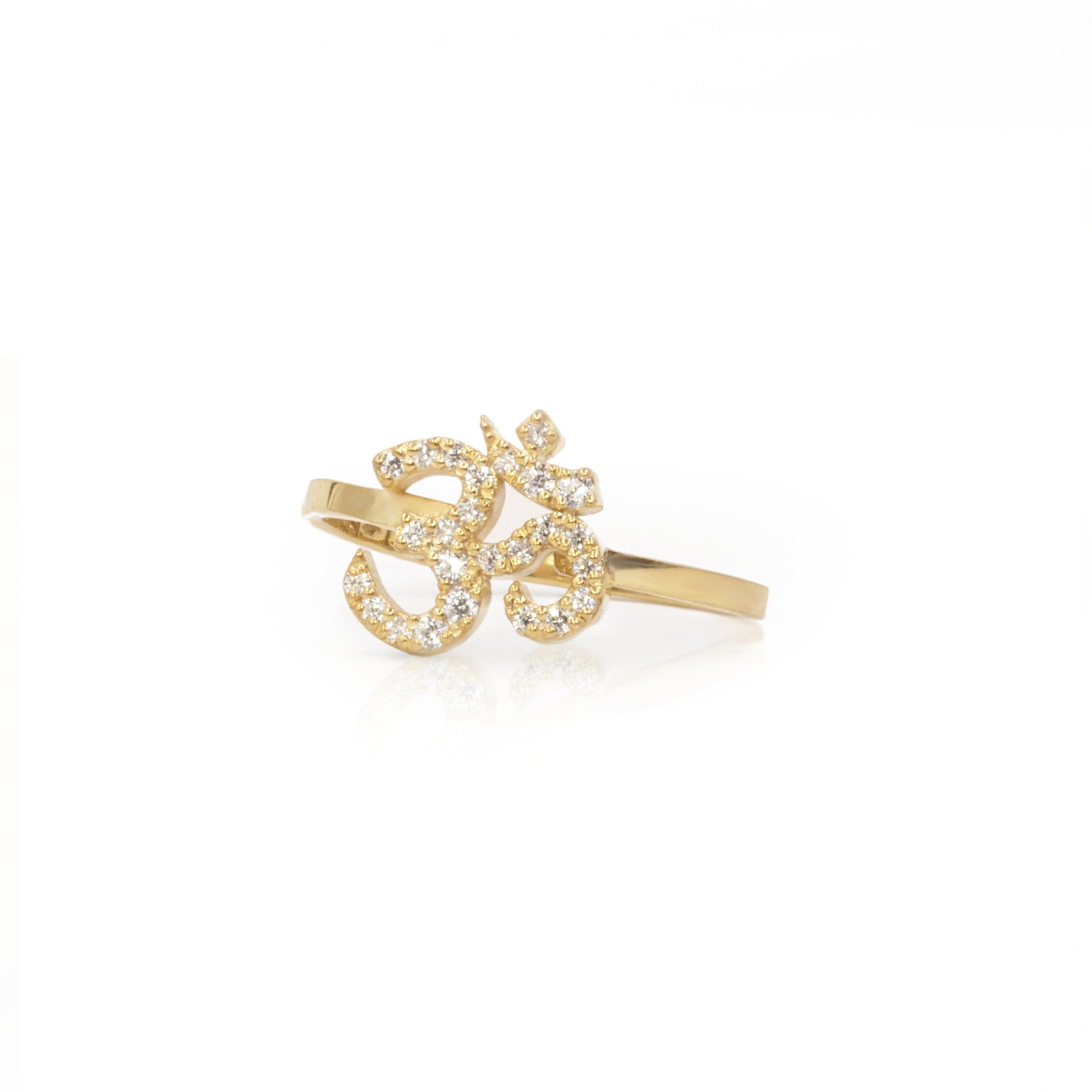 This ring features a beautiful Om symbol symbol in 18 or 14k gold hand set with white diamonds. Om,a symbol popular between those who practice spirituality, zen and yoga is used to represent self within, truth and knowledge.
