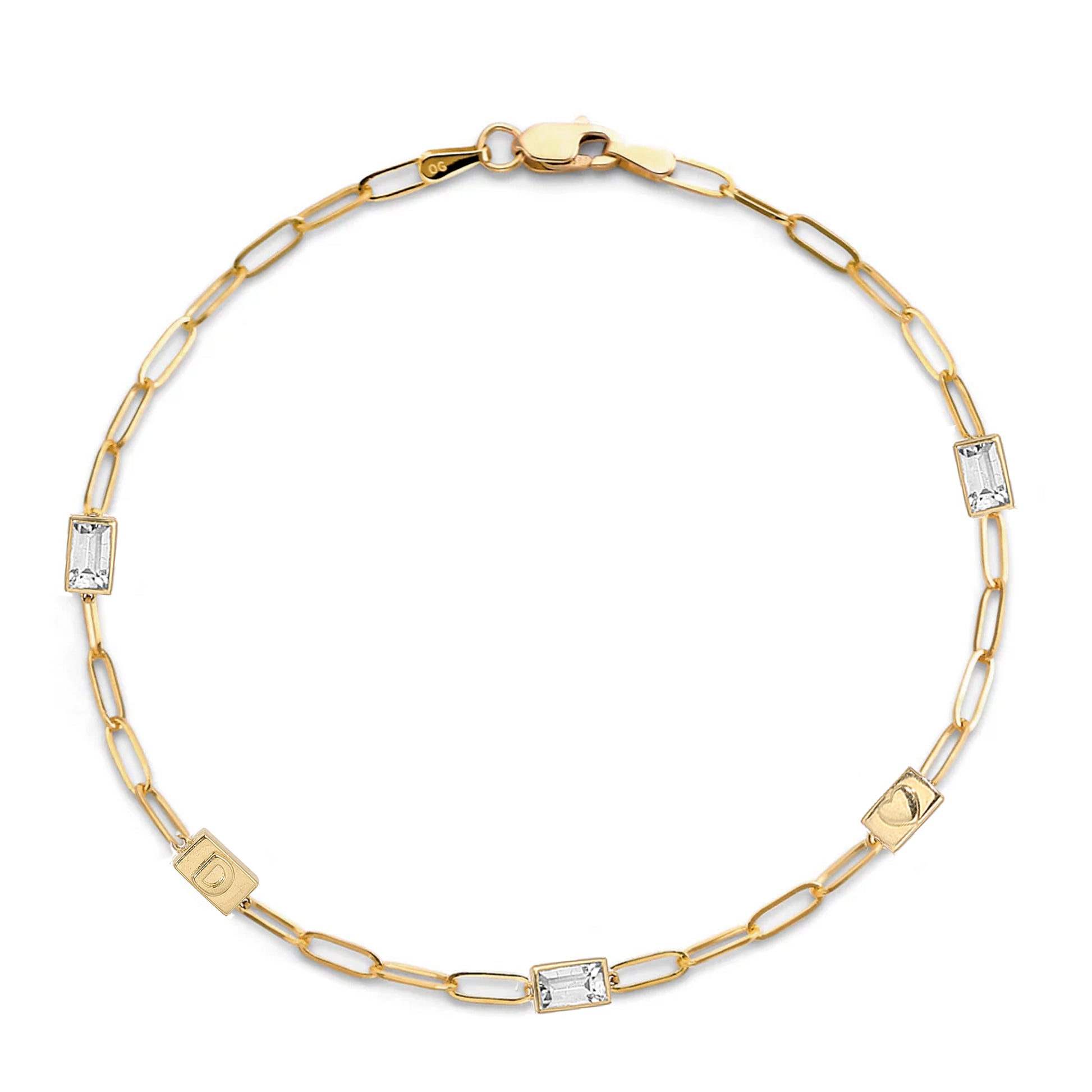 Introducing the Peekaboo Bracelet, a luxurious 14k gold piece that combines elegance with a touch of surprise. This bracelet features baguette-cut bezel-set gemstones that rotate to reveal a hidden initial or character on the back, offering a unique and personalized design. Whether you choose a radiant diamond or a selection of vibrant sapphires, this bracelet allows you to express your style in a truly special way. Customize your piece further by selecting the number of gemstones, engraving meaningful names or initials, and choosing your preferred gold color—whether classic yellow, sophisticated white, or romantic rose. The Peekaboo Bracelet is a stunning and versatile accessory, perfect for adding a personal and elegant touch to any look.