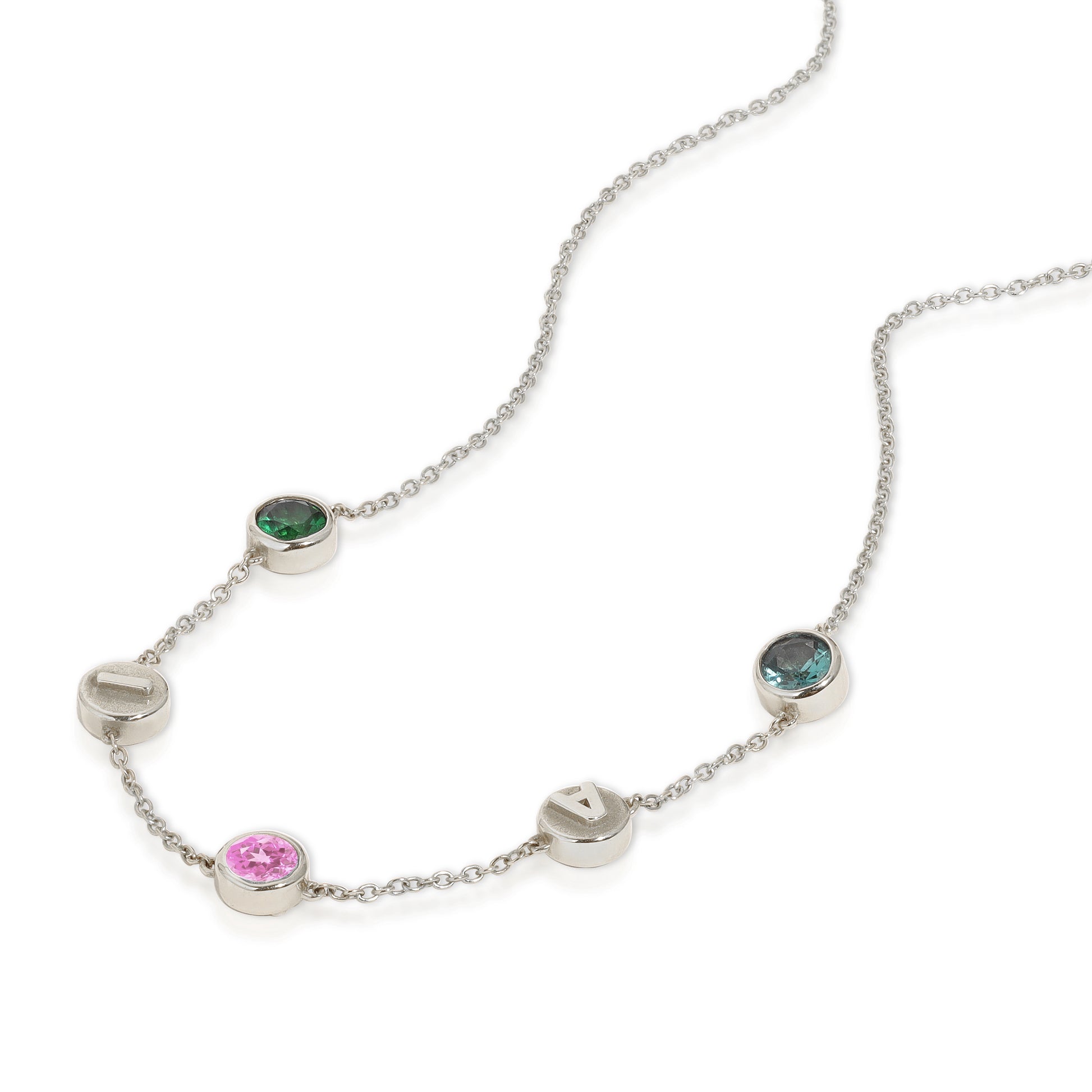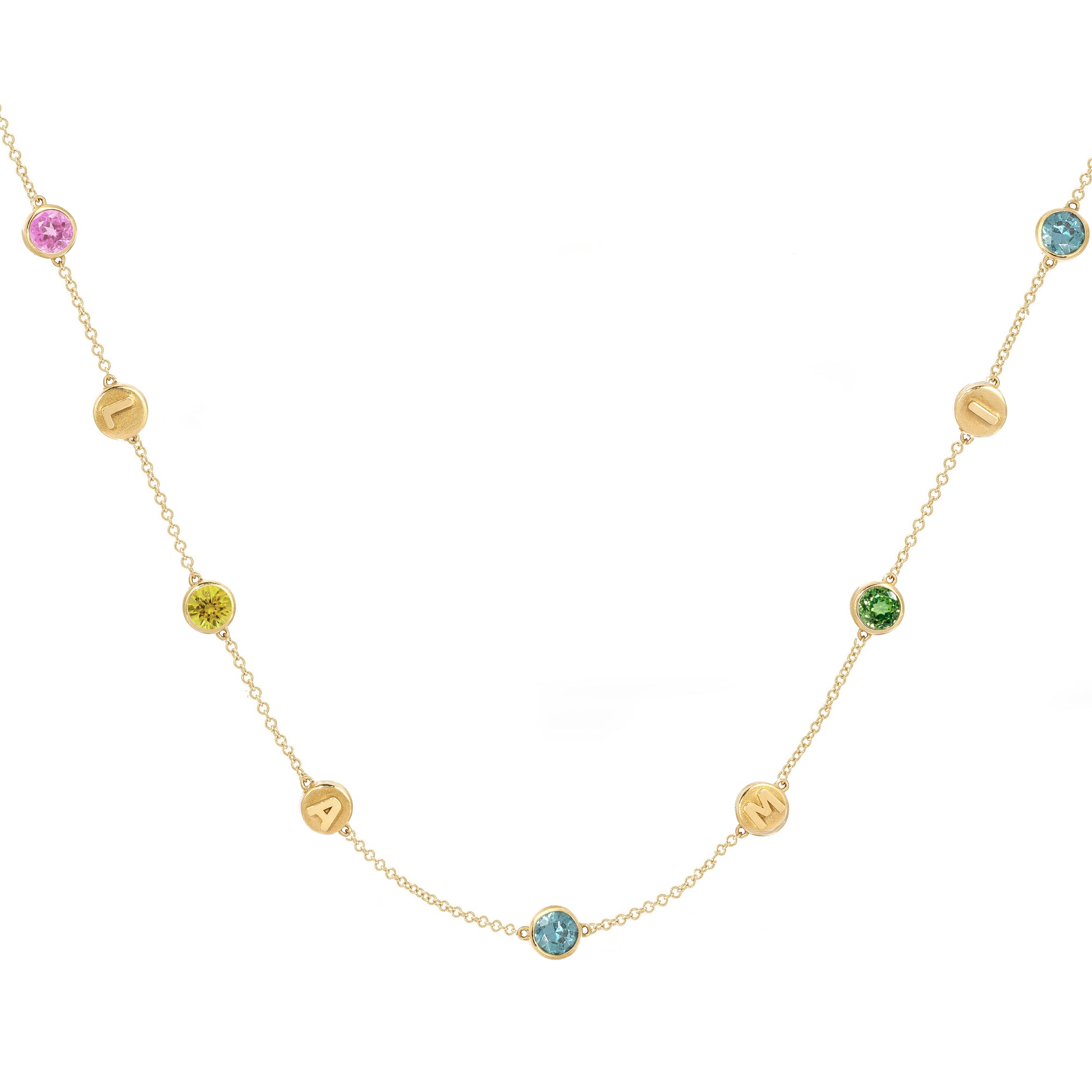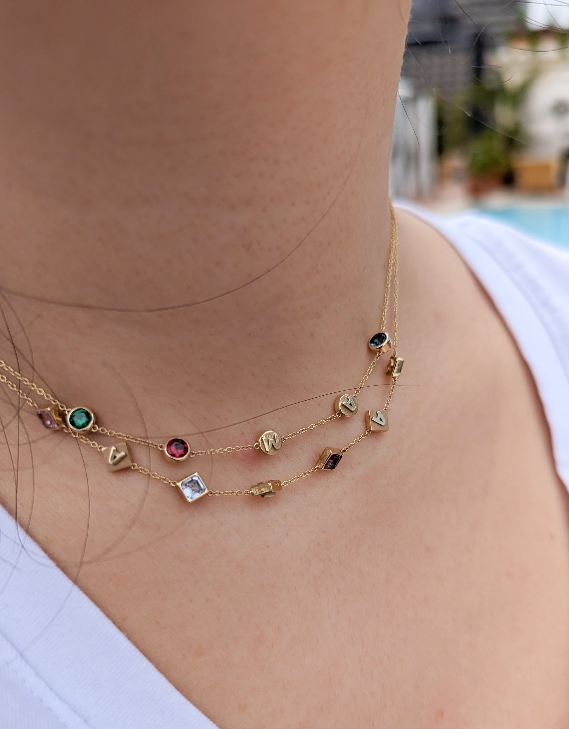 Introducing our stunning Peekabo necklace, a perfect blend of elegance and personalization. This exquisite piece features bezel-set brilliant cut gemstones that rotate to reveal a hidden initial or character on the back, offering a unique and intimate touch. You can choose your gemstone from a selection of brilliant diamonds or vibrant sapphires in various colors, allowing you to create a piece that truly reflects your style. Personalize your necklace further by selecting the number of gemstones, spelling a name or initials of loved ones, and choosing the color of gold—whether it's classic yellow, romantic rose, or timeless white. This necklace is more than just jewelry; it's a personal statement of elegance and sentimentality.
