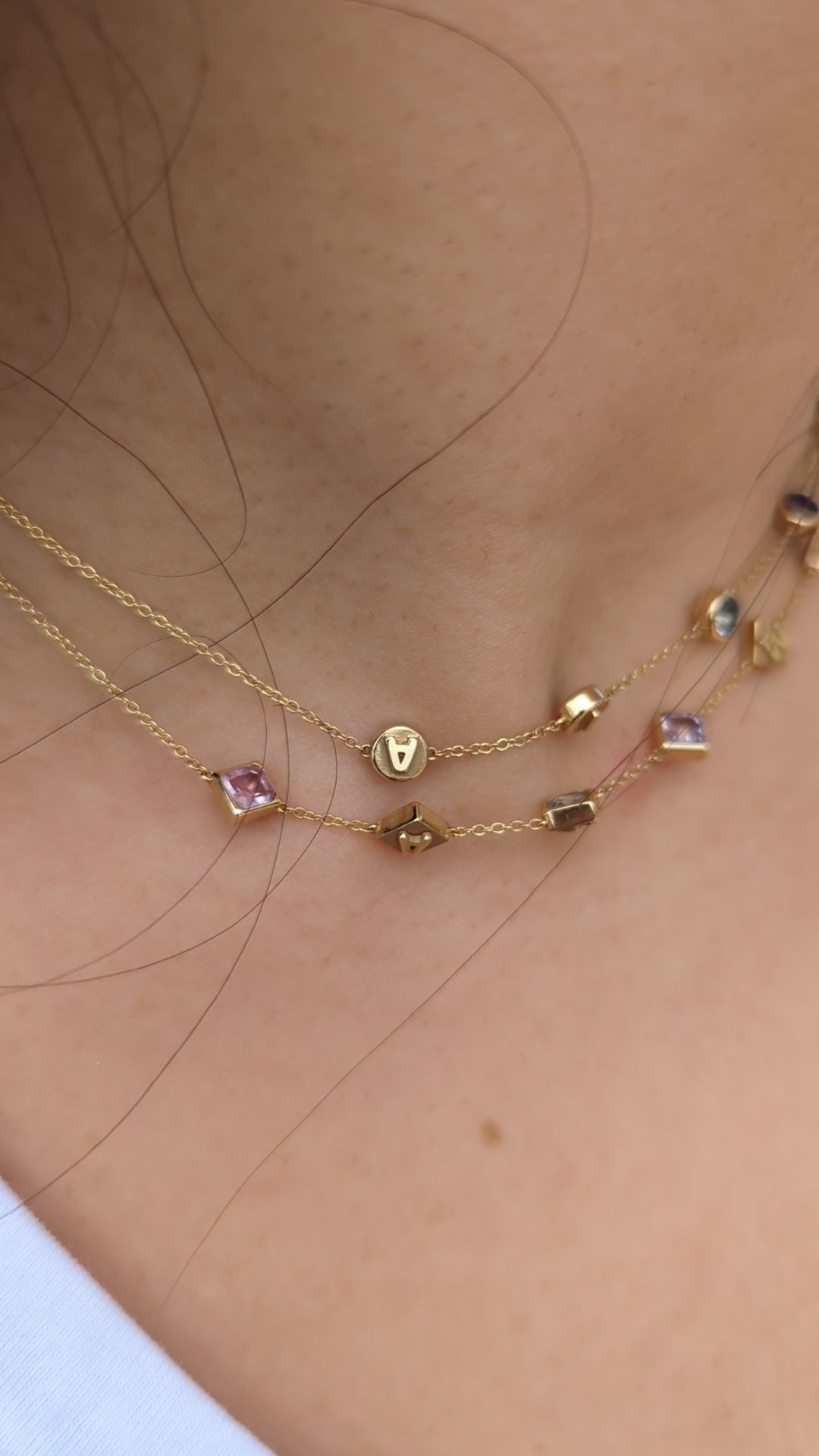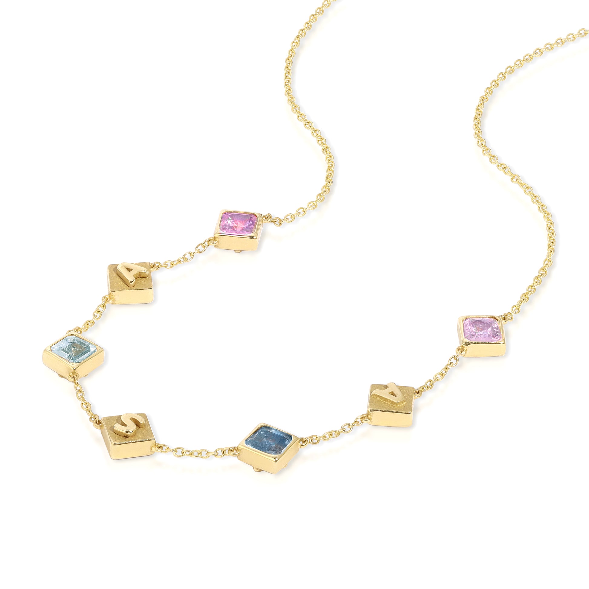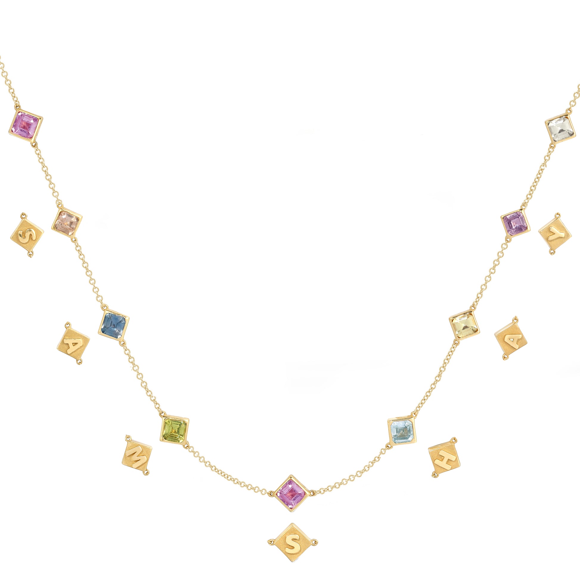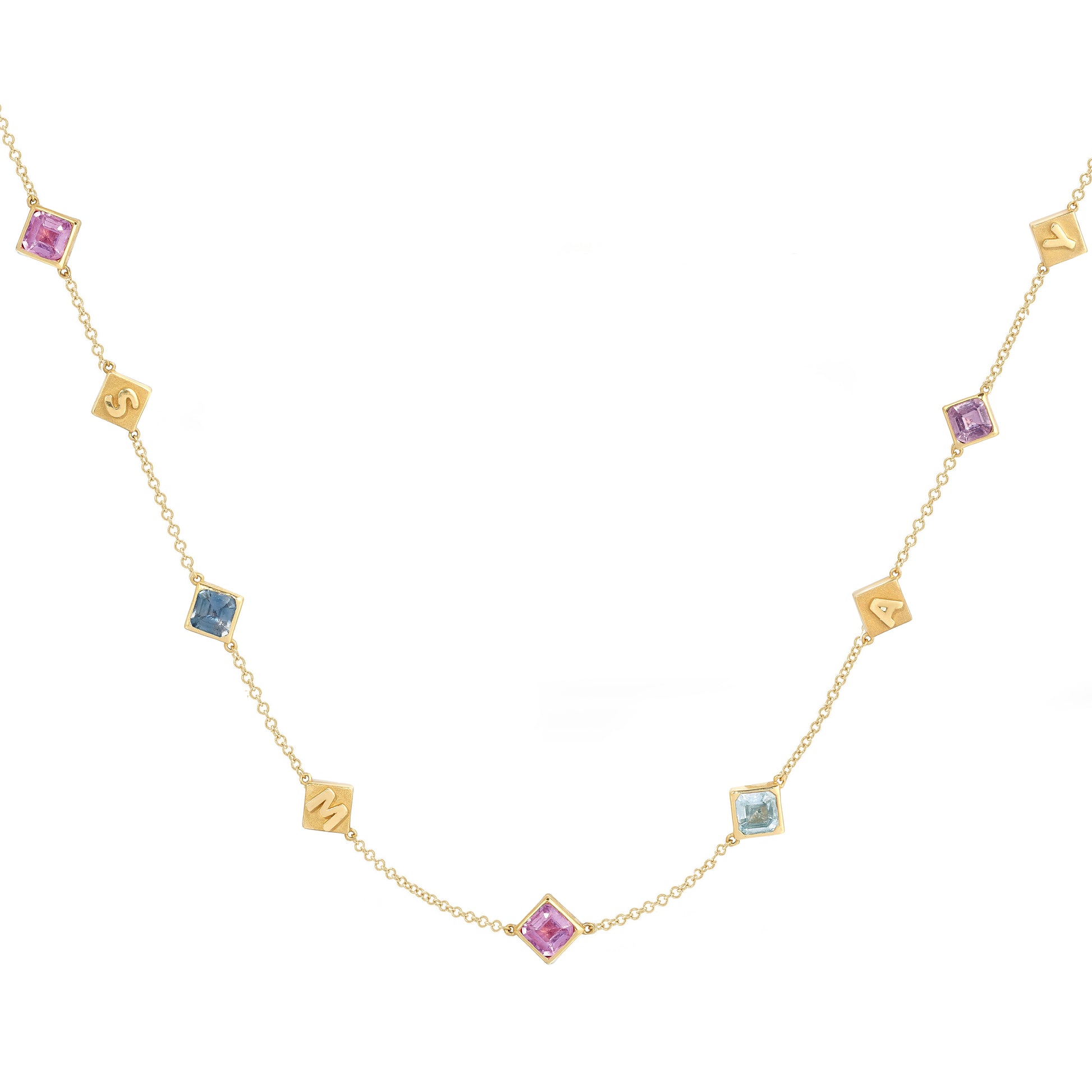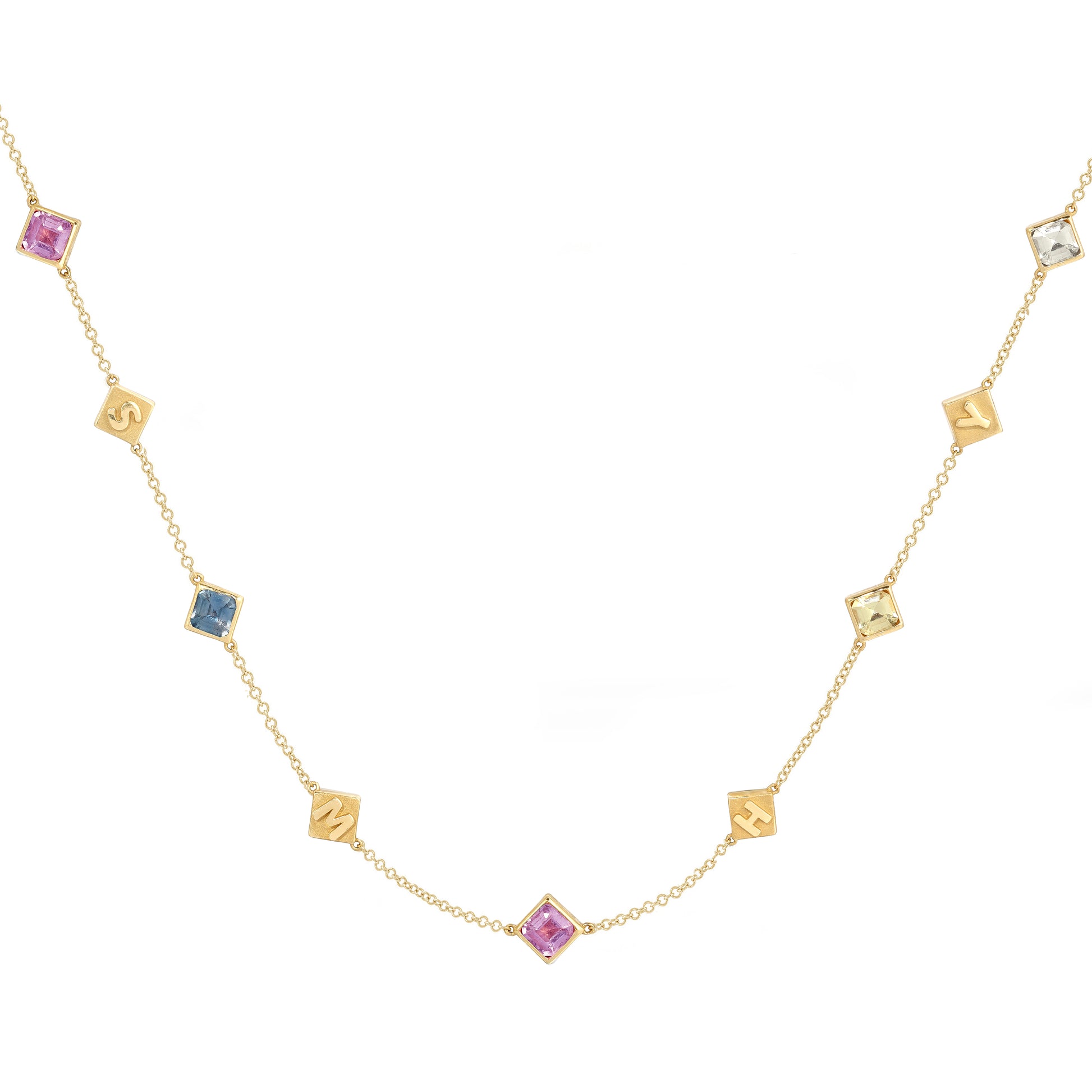 Introducing our stunning Peekabo necklace, a perfect blend of elegance and personalization. This exquisite piece features bezel-set princess cut gemstones that rotate to reveal a hidden initial or character on the back, offering a unique and intimate touch. You can choose your gemstone from a selection of brilliant diamonds or vibrant sapphires in various colors, allowing you to create a piece that truly reflects your style. Personalize your necklace further by selecting the number of gemstones, spelling a name or initials of loved ones, and choosing the color of gold—whether it's classic yellow, romantic rose, or timeless white. This necklace is more than just jewelry; it's a personal statement of elegance and sentimentality.