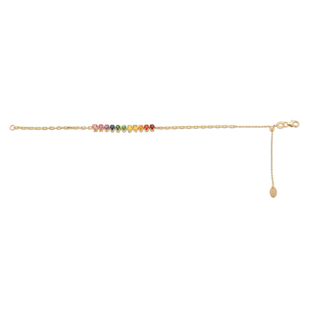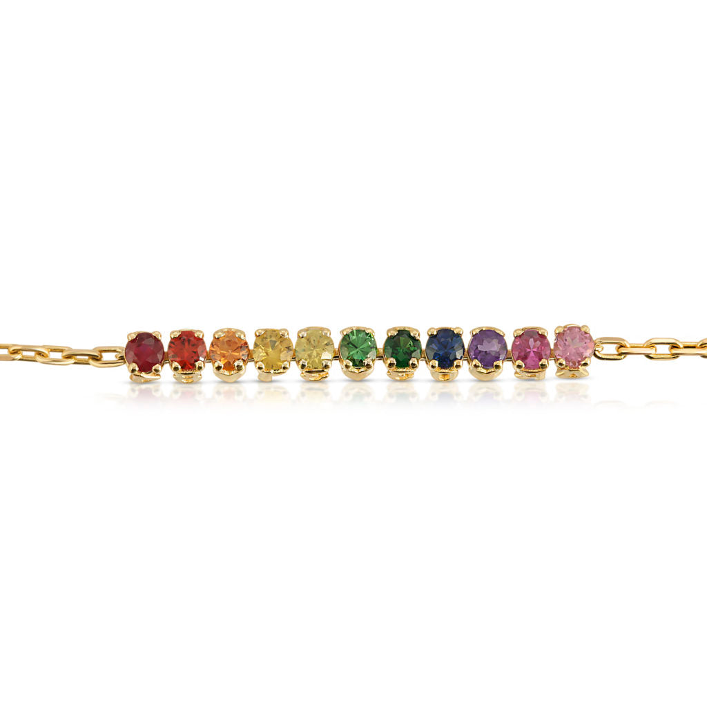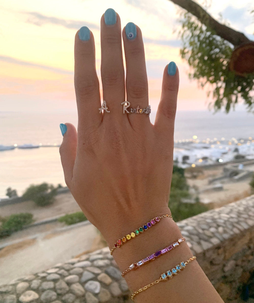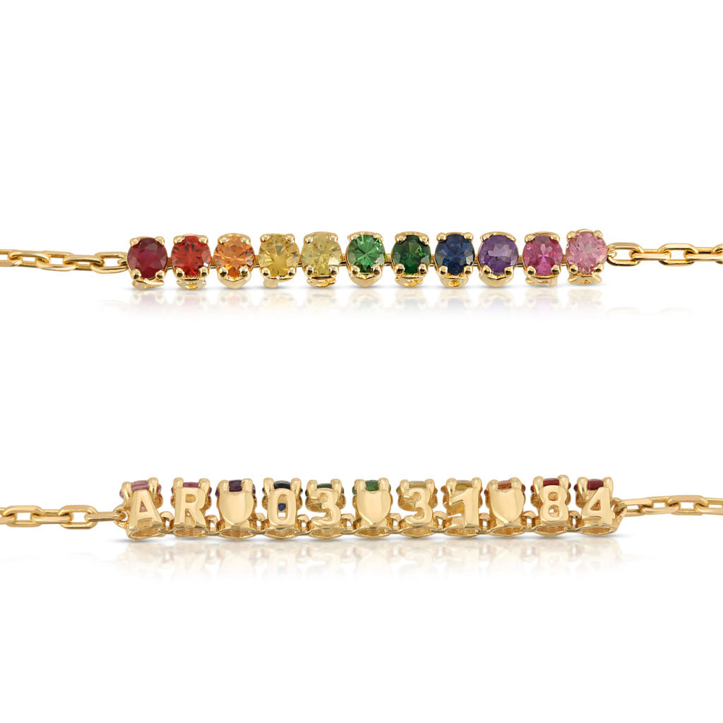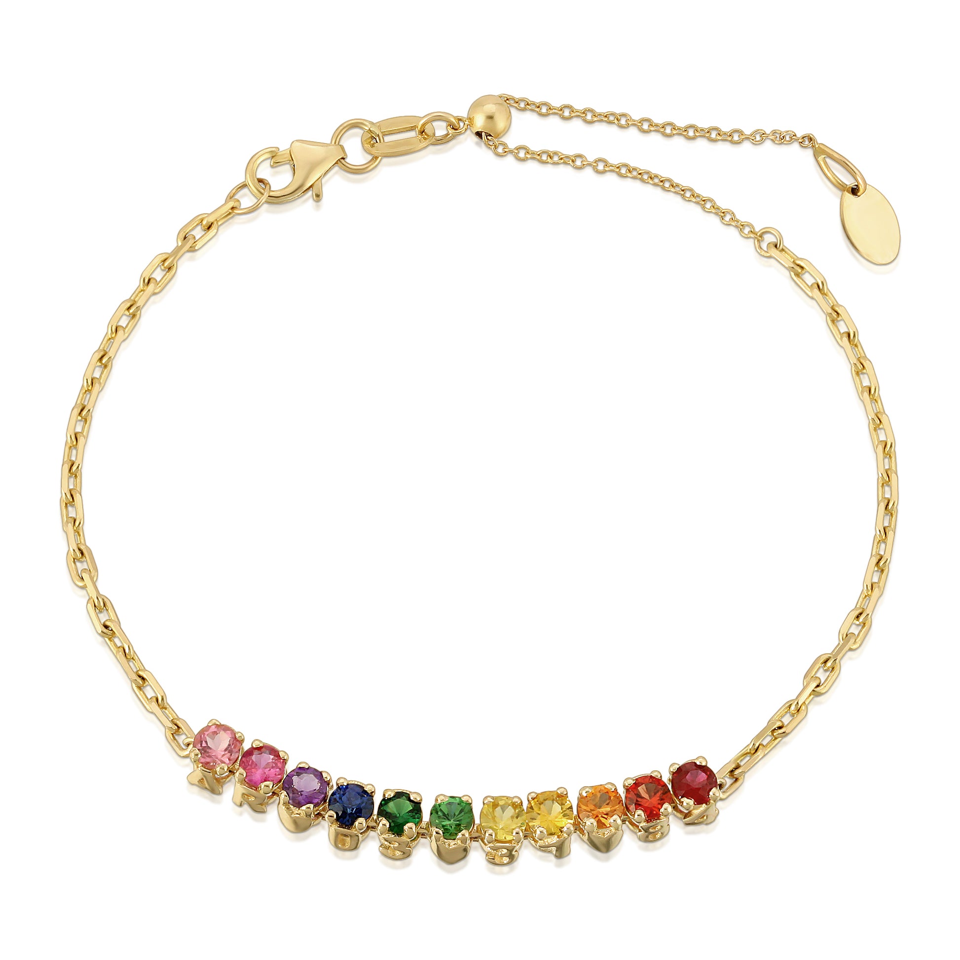 This beautiful tennis Bracelet set with deep color gemstones is the most unique tennis bracelet in the jewelry world. The setting of each stone is built of a letter from side view and the bracelet together spells out your choice of words. The bracelet is fully adjustable with a silicone ball so that it will always sit tight to your arms.
