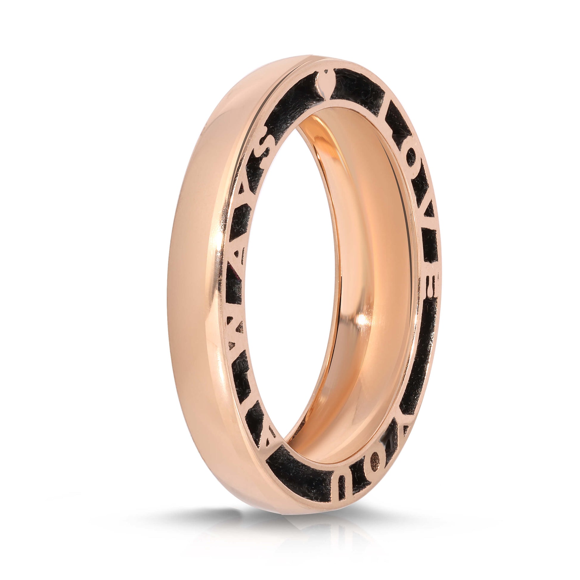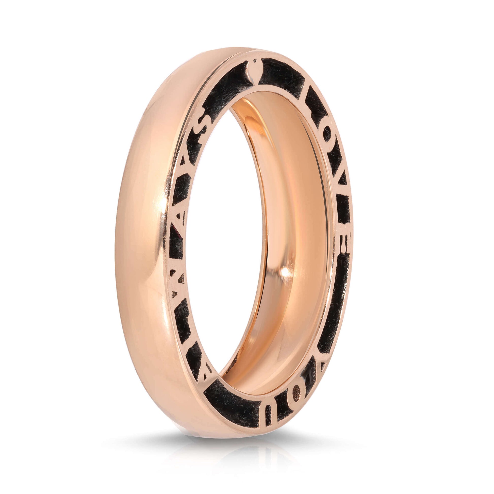 Classic, personalized and unique, each hide-and-seek design is a complex feat of craftsmanship. This eternity band is crafted with 14k or 18kt gold, then polished by hand for high shine. The ring seems like a classic dome band from the top, but only when looking closer, you will see the ring has a special message on the side. You can write up to names, dates or a special mantra, this piece is uniquely made for you. The gold and the letters play hide and seek with the viewer when worn.