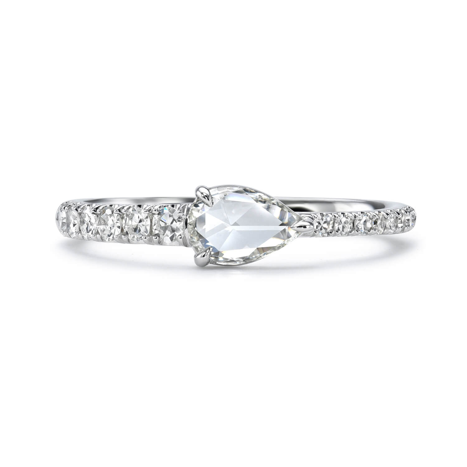 Introducing our Rose-Cut Pear Shape Diamond Ring—an exquisite fusion of modern allure and timeless elegance. This stunning ring showcases a captivating pear-shaped rose-cut diamond that can be set horizontally or vertically, nestled within the embrace of 14k white gold. Delicate diamond pave shoulders add a touch of brilliance and refinement to complete this exceptional design.