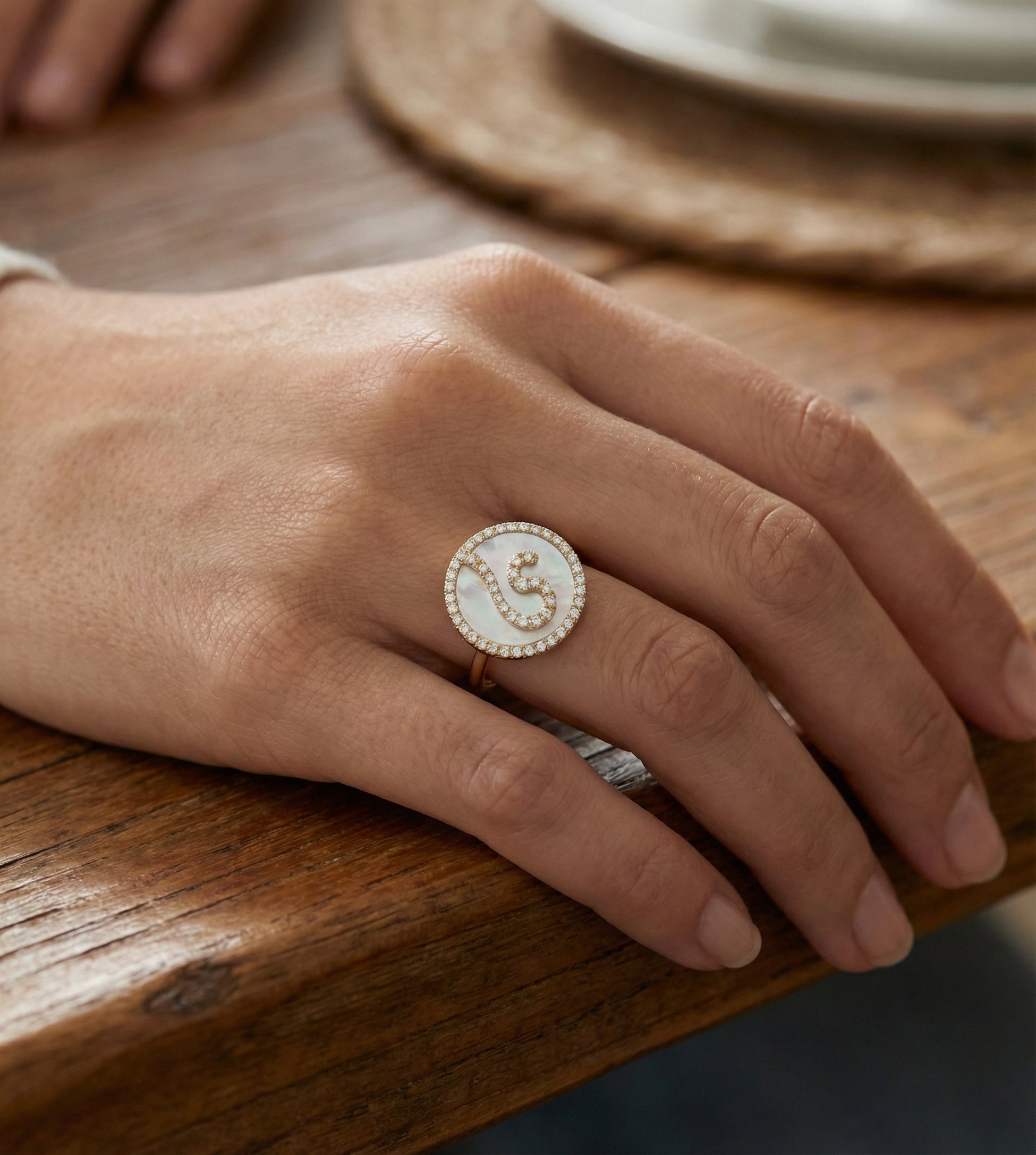 - This beautiful ring features a Mother of pearl with a diamond Arabic initial Y in the center