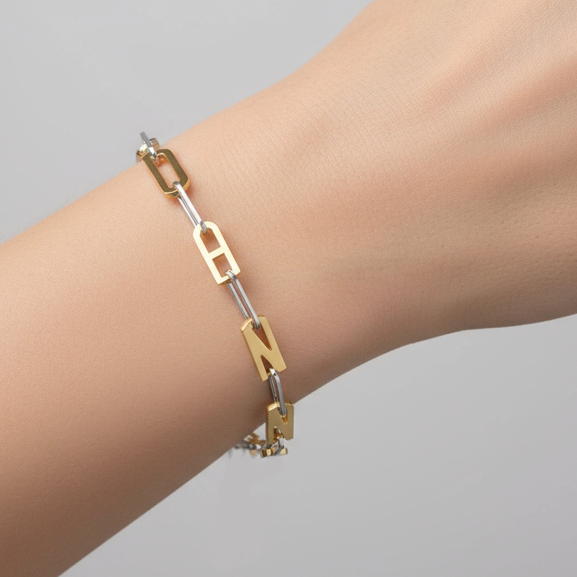 Silver and Gold Paper clip chain Bracelet with gold letters