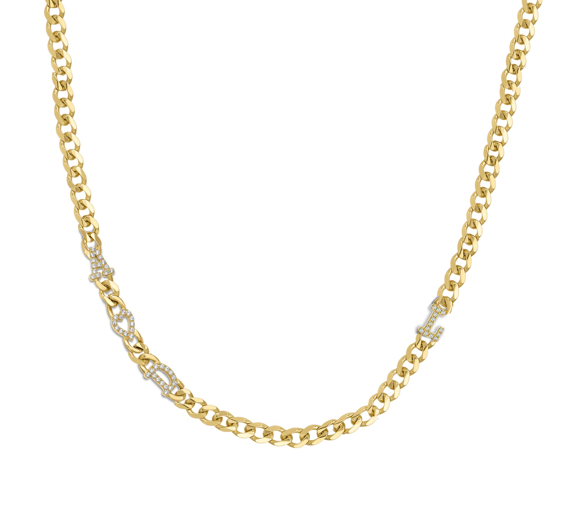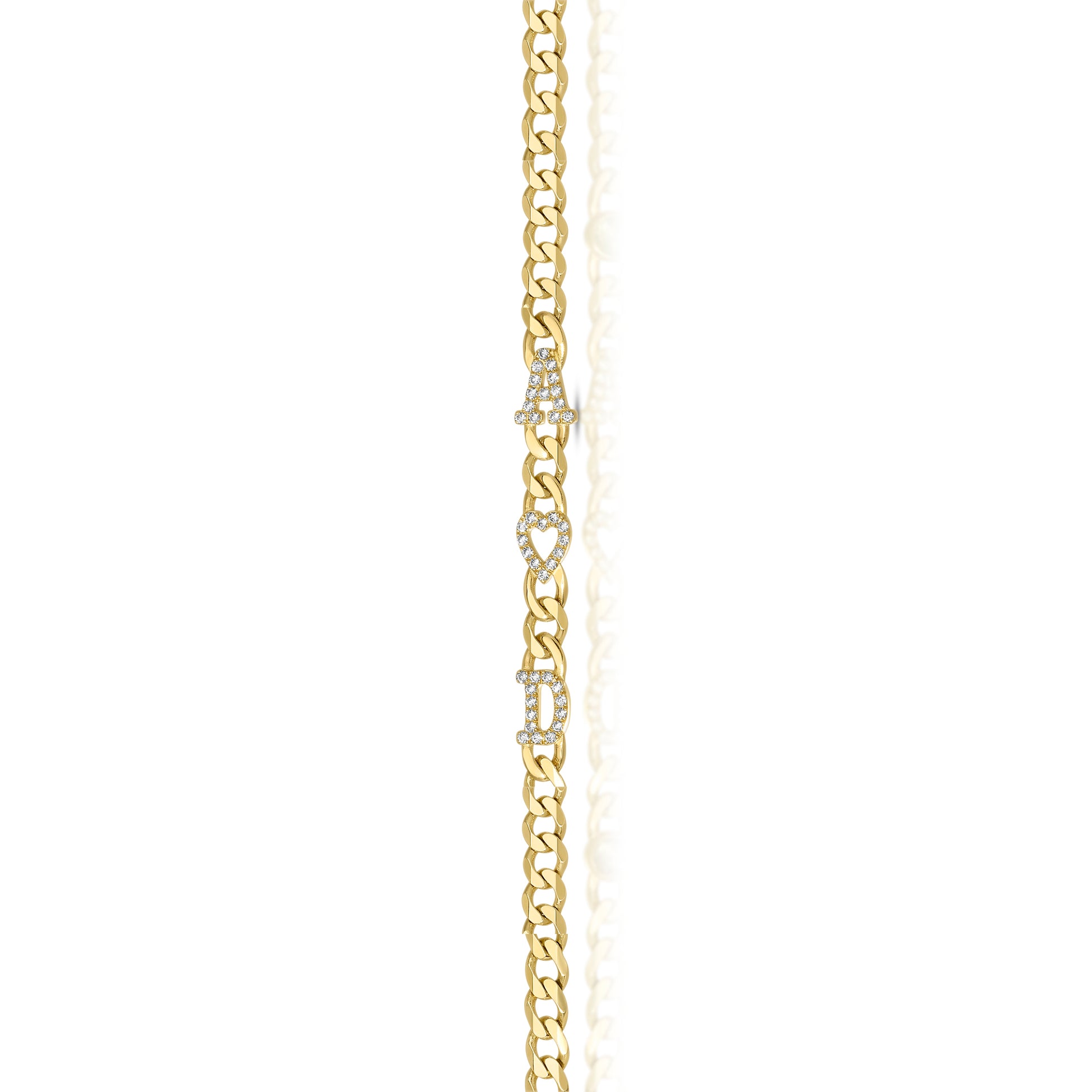 Elevate your style with this luxurious 14K solid gold necklace, featuring a 3.4 mm classic curb chain that exudes timeless elegance. Customize it with letters and symbols with a pave of diamonds. creating a one-of-a-kind piece that reflects your unique personality. Whether you choose initials, meaningful symbols, or a splash of color with precious stones, this necklace is designed to be as unique as you are.