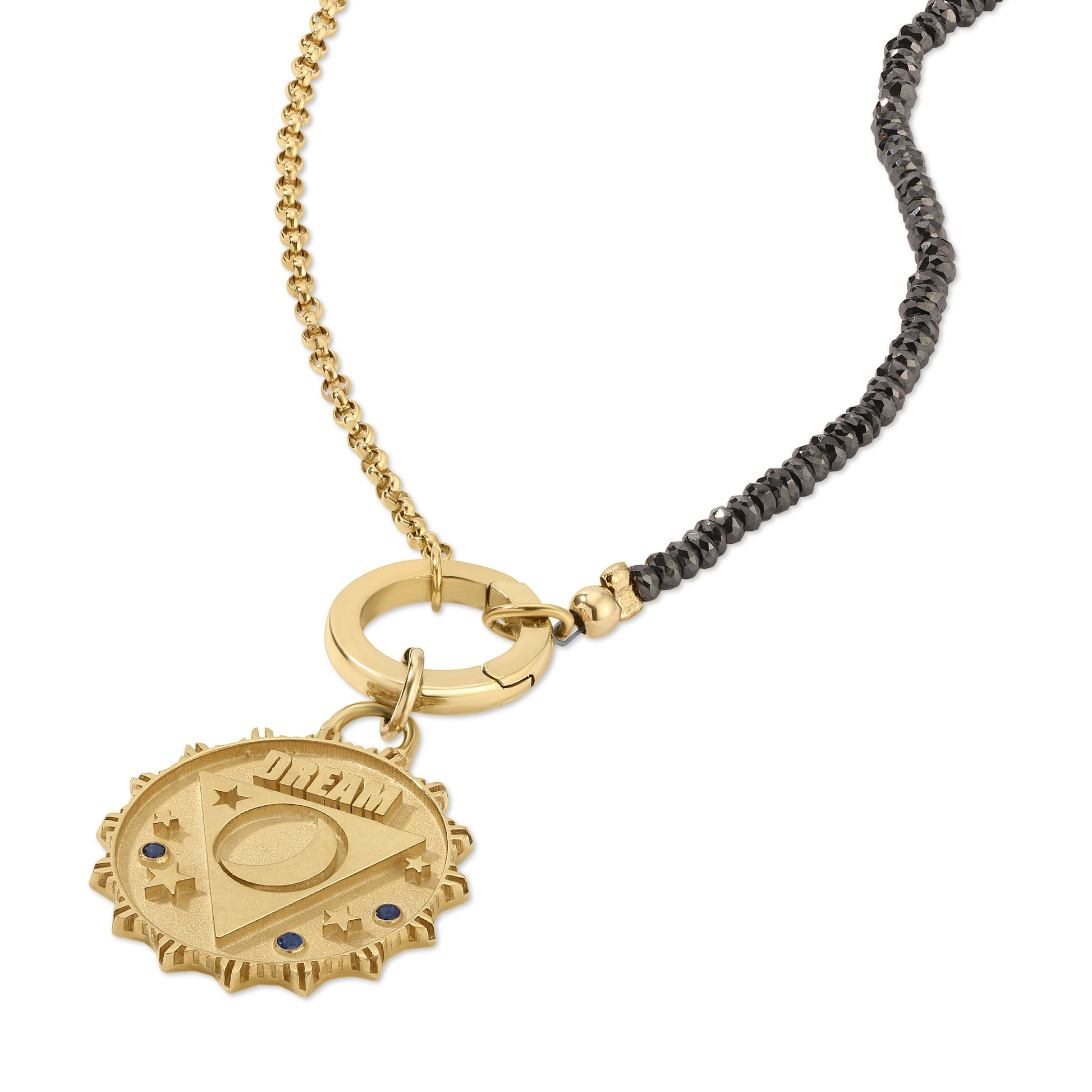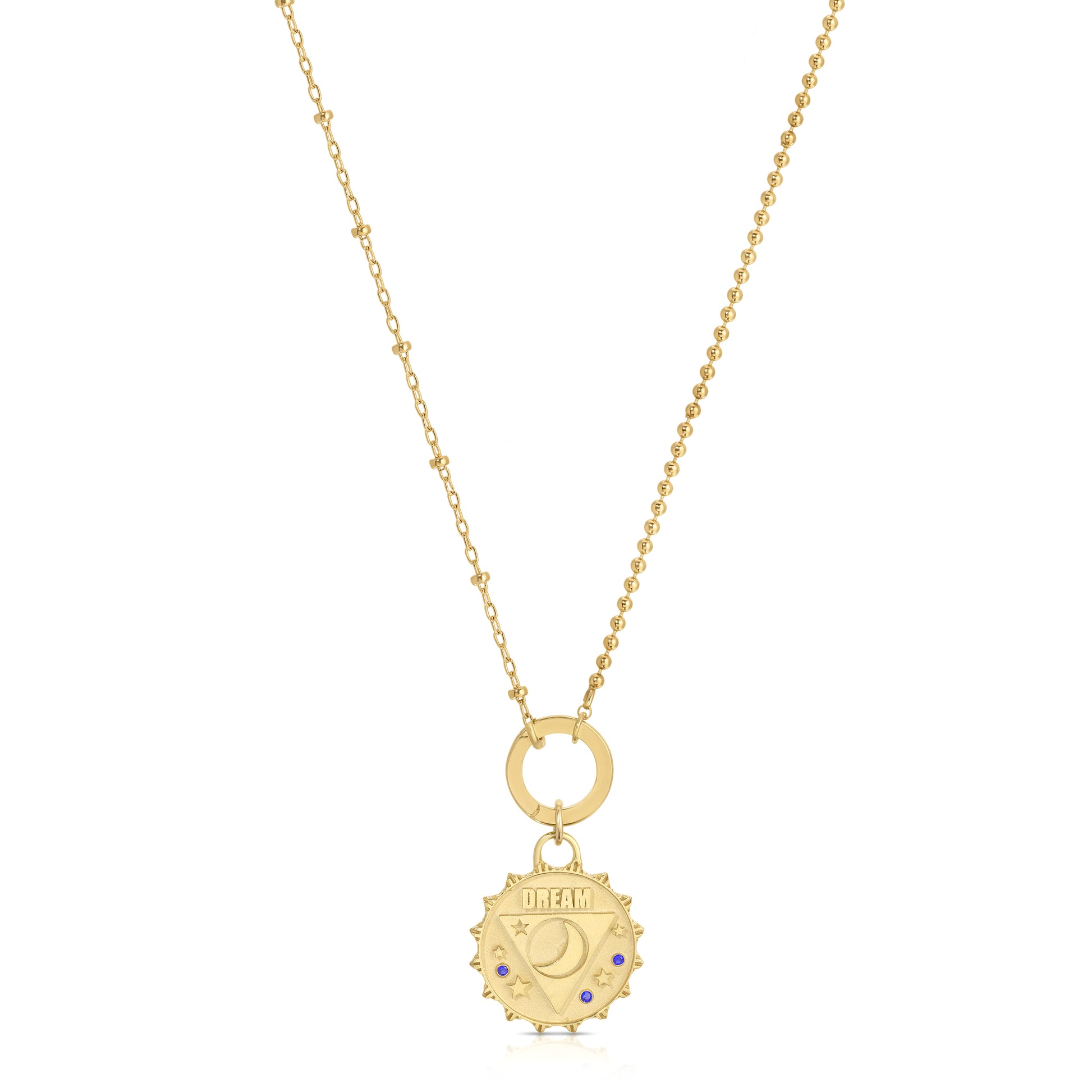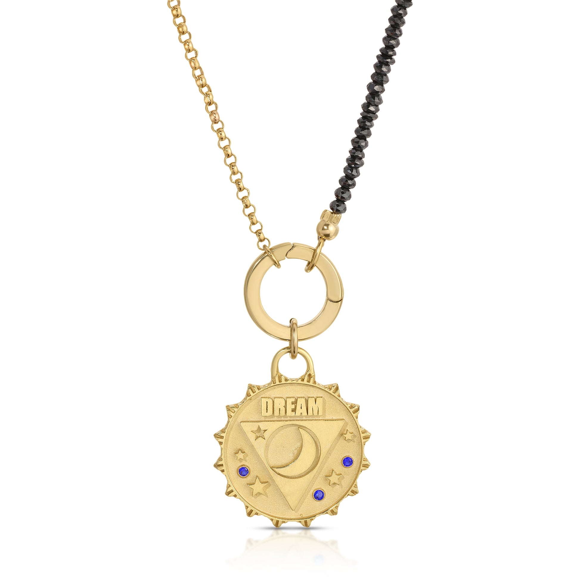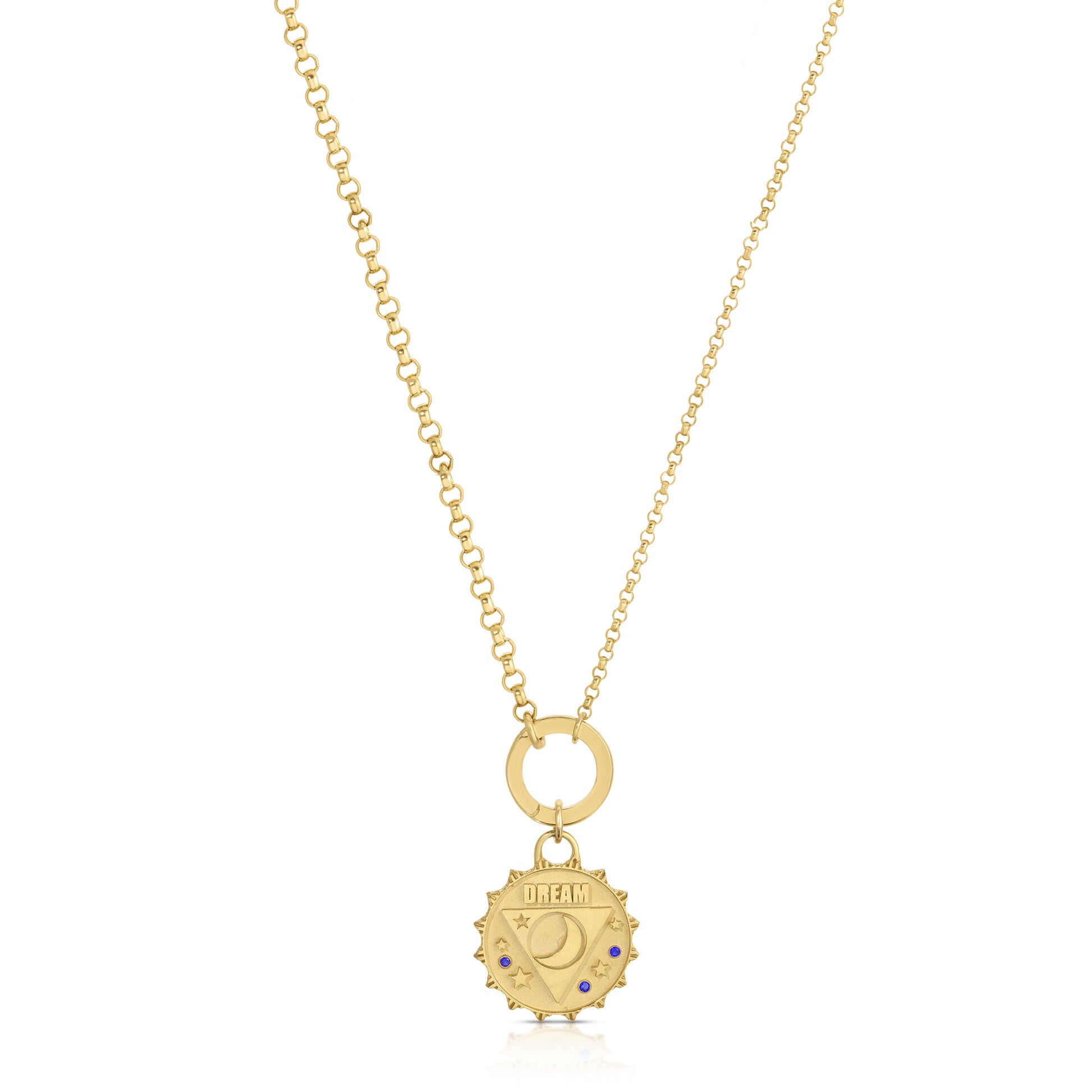 Our Dream medallion represents the Vishuddha, located in your throat which is the center of communication, emotion, and creativity. What you dream is what you make into your reality. The Lapis stones promote healing, control blood flow, and restore balance to the body and soul. The stars and the moon is a reminder to close your eyes and to take a moment to dream.