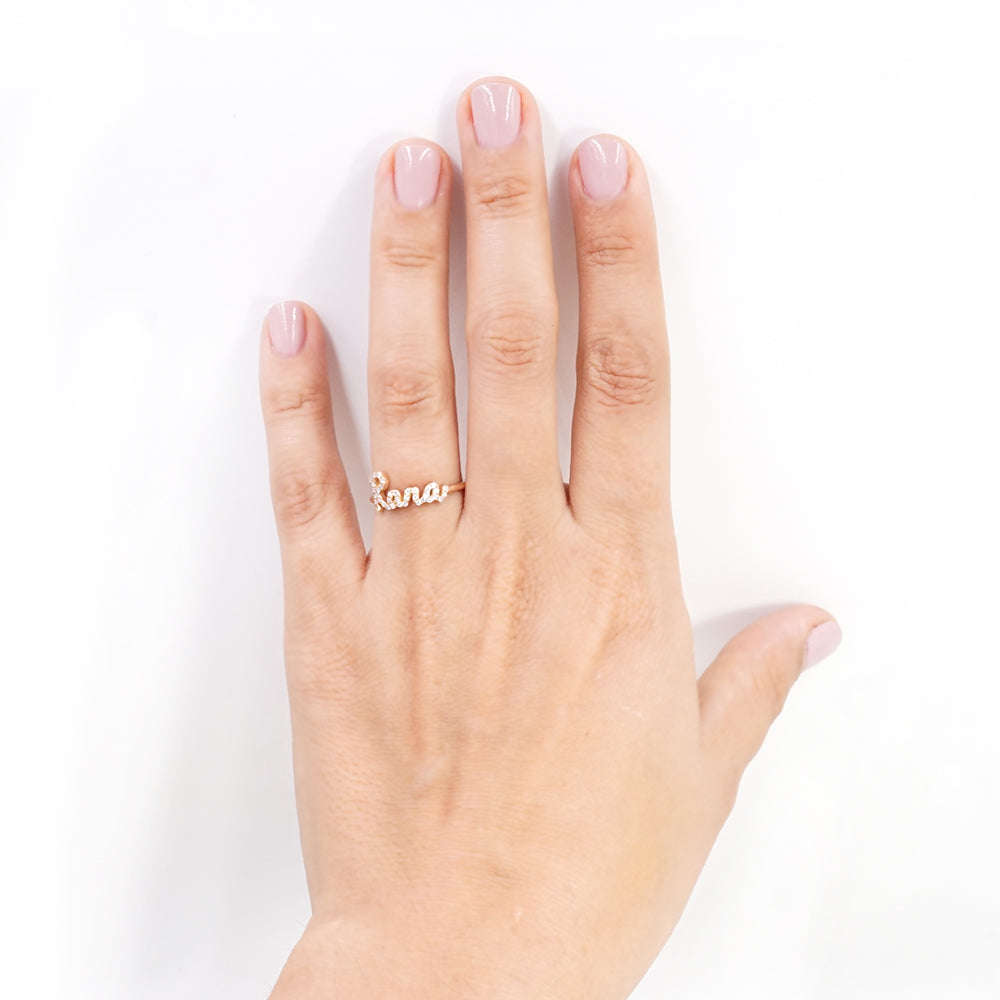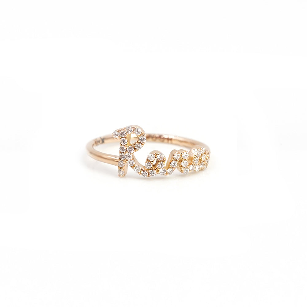 Can a ring get more delicate, more personal and more beautiful than this? we don't think so either. Order your name in the brightest white diamonds and 18k gold, written in a beautiful hand-scripted font, specially designed for you. Once we receive your order, we will send you the artwork of the specially designed ring for your approval before production. To order a double name ring please contact our customer service. Wouldn't this make the best personal gift of all times?